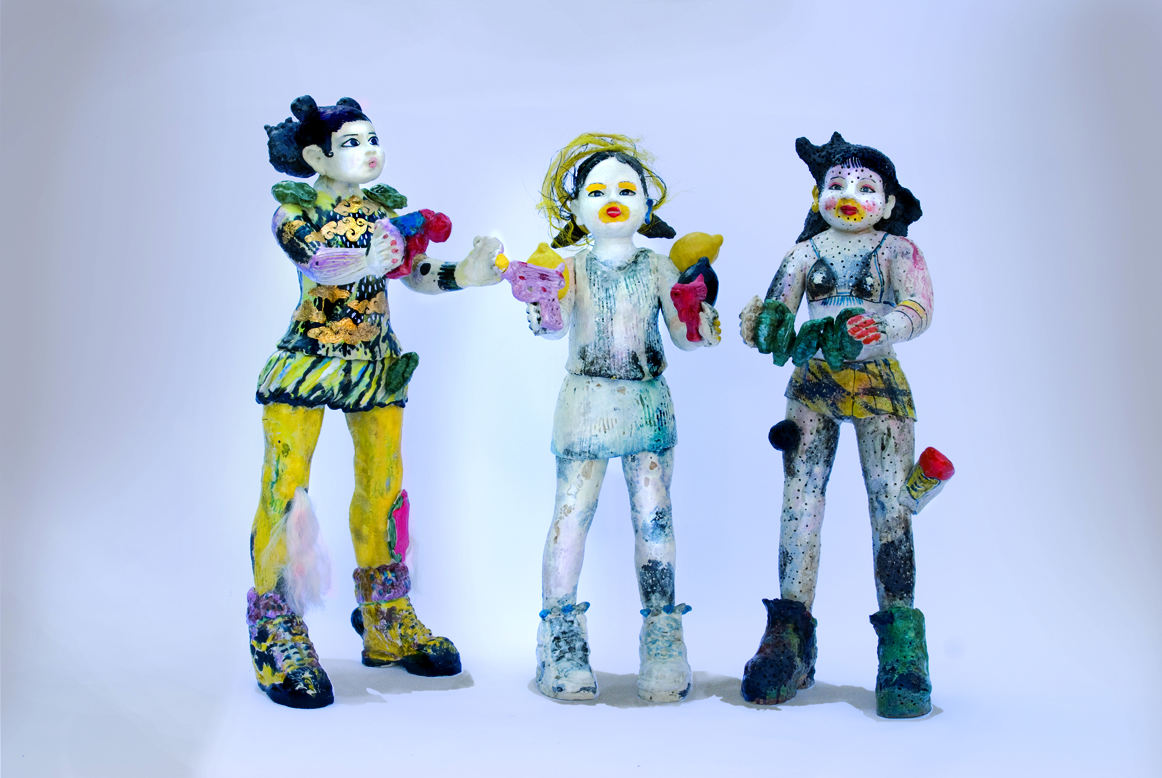 Les « Invincibles » présente une armée de sculptures d’enfants à échelle humaine. « Ces enfants guerriers ressemblent », nous dit Sabine Lalande, « à des clones ou à des petits dieux archaïques ». Ils évoquent tout à la fois des personnages issus des mangas japonais ou des films fantastiques mais aussi et surtout une réalité de la guerre telle que nous la voyons dans les médias : enfants d’Afrique ou du Moyen-Orient porteurs d’armes, enfants criminels, victimes et acteurs à la fois de la violence. Enfants engagés dans nos guerres d’adultes, emportés avec tout ce qui fait le monde de l’enfance, son imaginaire, ses jeux.