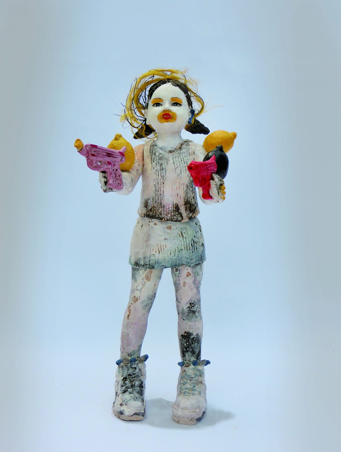 « L’enfant ? C’est l’image de l’innocence, le temps de l’enfance renvoie d’abord à celui du jeu et de l’imaginaire », témoigne Sabine Lalande, « pas à celui de l’agressivité, de la violence et de la guerre ». Et pourtant, sous nos yeux, se déploie un bataillon d’enfants-soldats, quinze sculptures à taille humaine : pas des enfants miséreux mais des gamins bigarrés et multicolores, blancs-noirs-jaunes, qui expriment toute la palette de couleurs de l’univers. Toute sa violence et son horreur également : dans leurs mains, pistolets et fusils-mitrailleurs. Des jouets fictifs ou des armes réelles ? Là réside l’ambiguïté apparente du travail de Sabine Lalande : grès et céramique, les matériaux utilisés sont beaux et fragiles, la couleur explose au visage du visiteur.