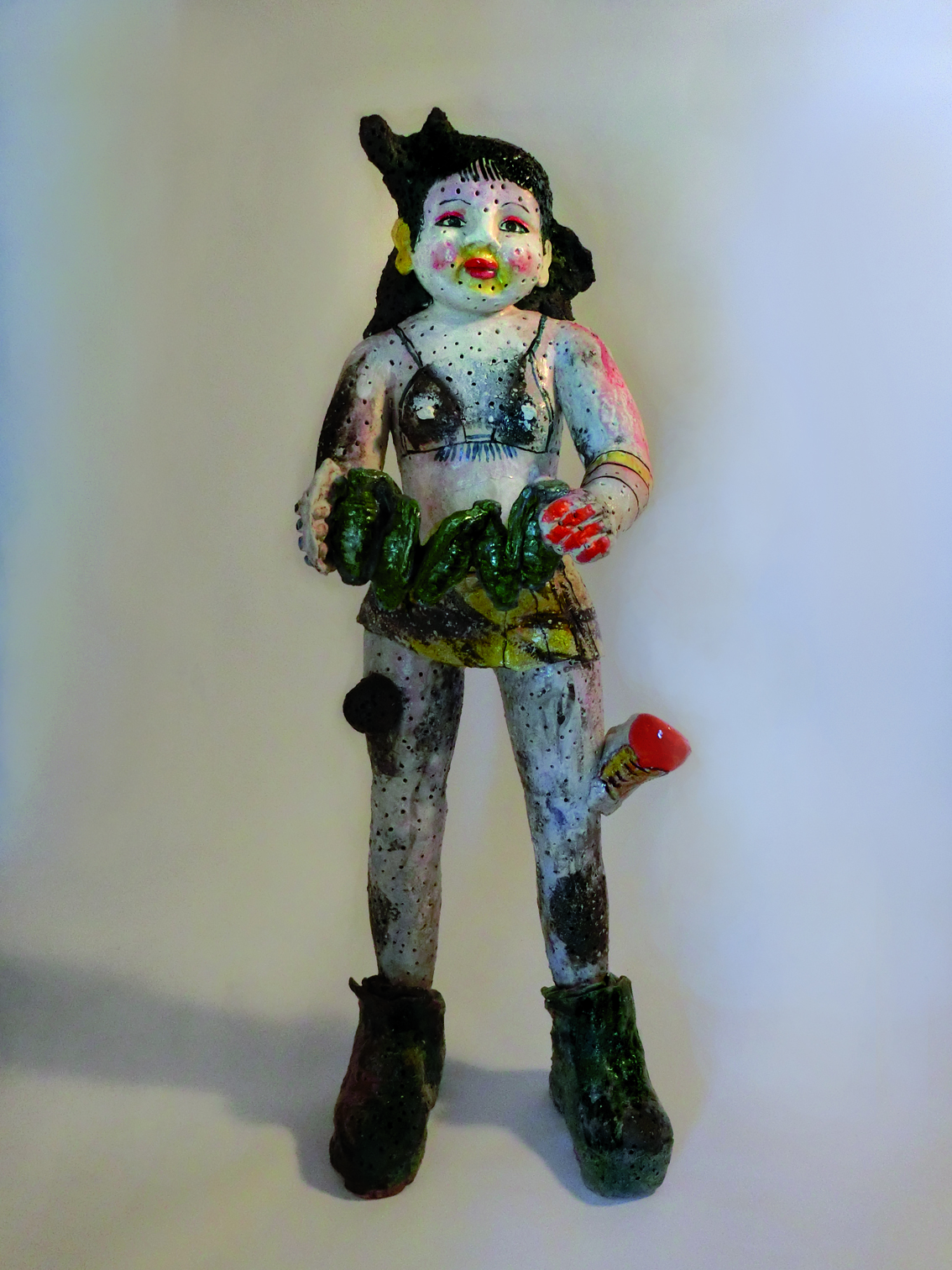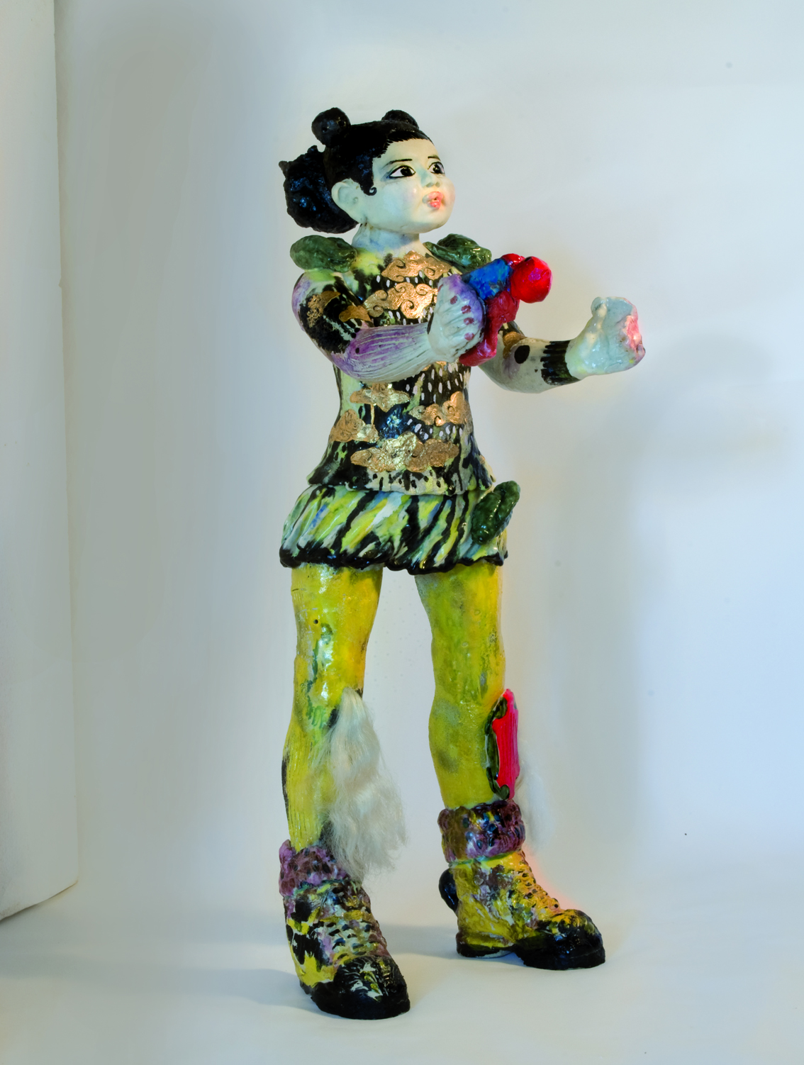 Les sujets que façonne Sabine Lalande sont glorifiés par le choix du matériau qu’elle emploie. Si ces enfants guerriers représentent en effet une certaine réalité, ils sont à la fois sacralisés (c’est elle qui utilise ce terme) par la matière – le grès – dans laquelle ils sont fabriqués, et les ornements « décoratifs » dont ils se parent. Car le grès offrant la propriété d’être aussi bien lisse que rugueux, des parties sont par endroits très brillantes, leur donnant l’aspect de petites poupées de porcelaine, tandis que par ailleurs, en opposition, le grain, la texture leur confèrent comme un aspect minéral, quelque chose de sophistiqué, qui monterait du riche Occident à la surface des choses, par contraste avec ce côté déshérité, ramené à sa plus simple expression, archaïque.