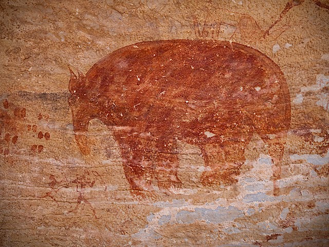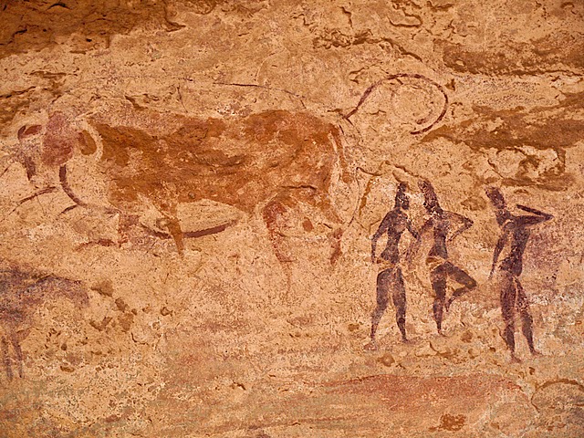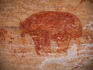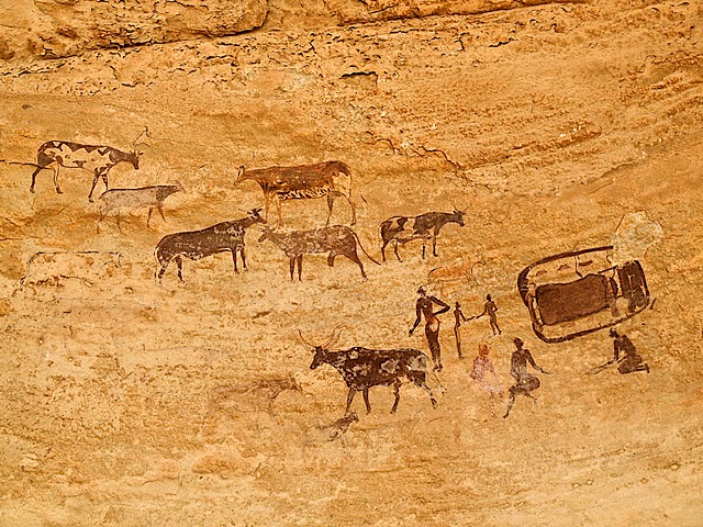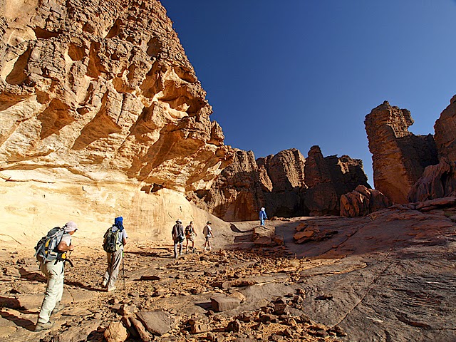 La colonne de randonneurs, enrubannés pour d’aucuns à la mode touareg, se met en branle dans ce décor grandiose. 700 mètres de dénivelé positif, frontal et brutal, pour quitter la piste désertique et atteindre le Tassili N’Ajjer, le « plateau des vaches » en langue Tamacheq, le Sahara du sud-est algérien à proximité de la frontière libyenne. S’élever et progresser pour s’enfoncer, subitement et radicalement, dans un autre monde et un autre temps, au temps où le Sahara ne ressemblait point encore à ces paysages apocalyptiques d’une splendeur sidérante, dignes d’un film de science-fiction et comparables à des lendemains de catastrophe atomique… Le dépaysement est à l’œuvre, chacun perd vite ses repères et s’immerge, des pieds et des yeux, dans une autre civilisation, une autre culture ! Un premier choc que cette marche dans le désert sous le sceau du silence et du soleil, un second au détour d’une crevasse ou d’une grotte : la découverte de peintures et gravures, près de 15 000, d’une extraordinaire beauté où s’exposent sur les parois rocheuses éléphants, girafes, vaches et chevaux, scènes de chasse ou de vie familiale il y a 12 000 ans environ.
