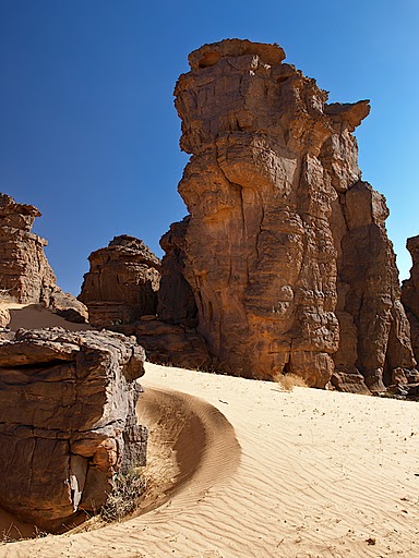 Entre ciel et terre, sable et pierres, canyons de rocaille et langues dunaires, les yeux grands ouverts sur un irréel paysage lunaire : à perte de vue et pour toute ligne d’horizon, des massifs érodés, taillés et sculptés tant par le vent du désert que par la dégradation naturelle et climatique !