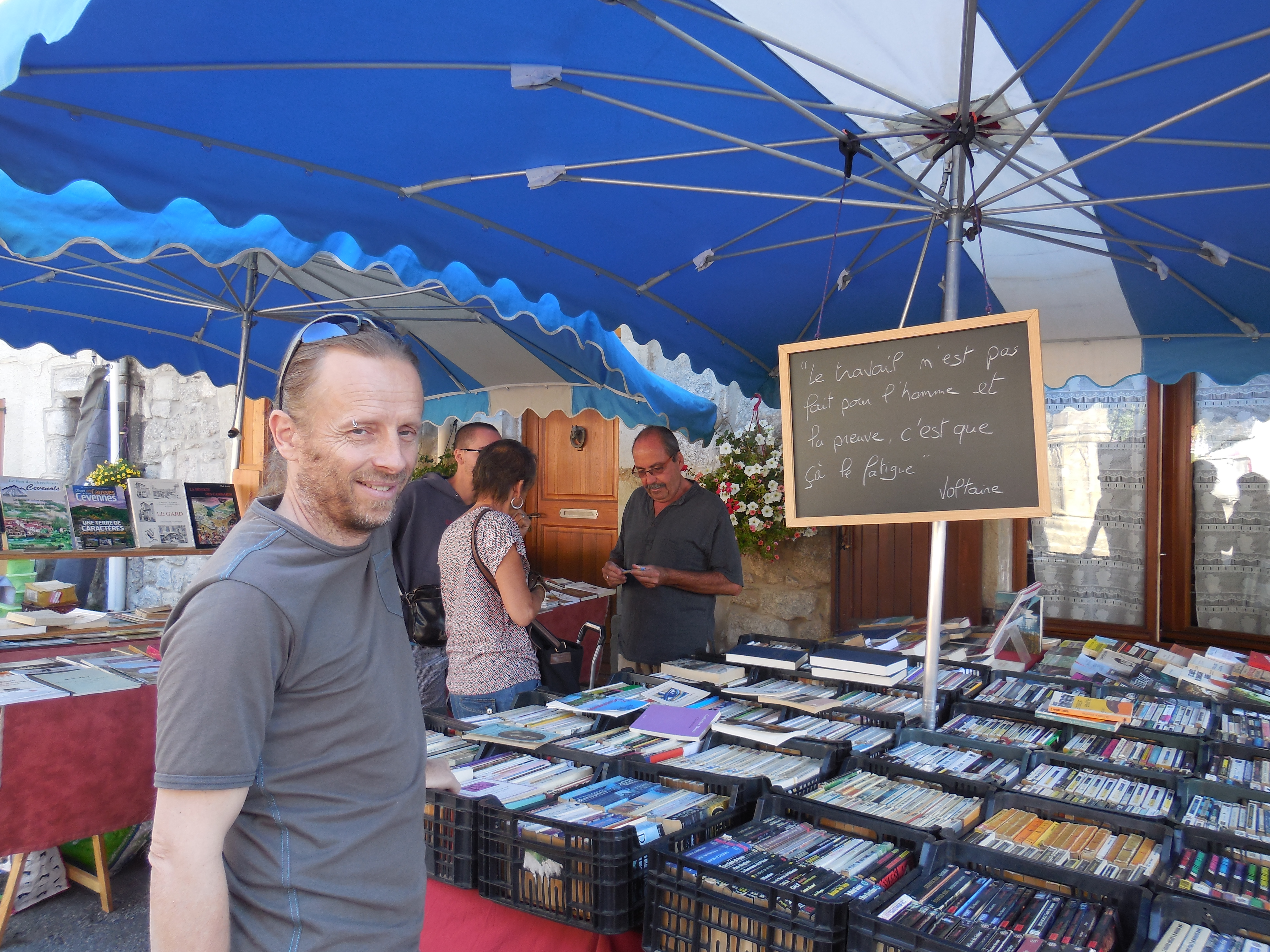 D’ailleurs, cet après-midi -là, le récit qu’il nous livre est soudain interrompu par le téléphone. L’appel vient de Turquie. Là-bas, une lectrice vient de recevoir le livre commandé. Elle s’exprime dans un français presque parfait. « Le livre est magnifique. En le feuilletant, j’y ai trouvé des fleurs séchées. C’est très émouvant, c’est très beau. Je tenais à vous dire merci ». Ému, Dominique raccroche. En souriant, il reprend ses explications. DSCN1108Outre ses ventes via les réseaux du livre d’occasion – passage obligé –, il pose ses tréteaux sur les marchés. On le croise à Vialas, à Génolhac, Villefort, Pont de Montvert, Bessèges… Aux habitués, aux fidèles s’ajoutent, l’été, les lecteurs en villégiature. Tous font leur miel de polars et de thrillers, de romans de science-fiction, d’histoires d’amour et d’auteurs cévenols à la plume trempée dans les guerres de religion, l’épopée des Camisards ou plongée au plus profond de l’histoire de la mine.