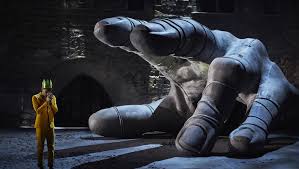 Belle déclaration d’intention que l’on ne retrouve pas forcément sur le plateau où règne sinon le chaos (pas celui de l’auteur, mais celui du metteur en scène), du moins une sorte de confusion déployée à grands frais, le coût de la production étant simplement faramineux et on peut légitimement se poser la question de cette « dérive » qui touche aussi bien un autre participant du festival, Julien Gosselin, ou ailleurs Vincent Macaigne, mais ceci est un autre problème qu’il faudra bien se résoudre à aborder un jour… Grandiose confusion sur le plateau, car il a fallu mettre les petits plats dans les grands. Thomas Jolly, à l’évidence, a peur du vide, ce que l’on peut à la limite comprendre dès lors qu’il s’agit d’habiter le vaste espace de la Cour d’honneur. Le metteur en scène signe lui-même la scénographie avec Cristelle Lefebvre. Une immense tête renversée et une énorme main sont posées sur le plateau (on a déjà vu cela assez souvent) sans malheureusement que cela serve à grand-chose, même si on ne saurait passer à côté de la signification de cet ensemble.