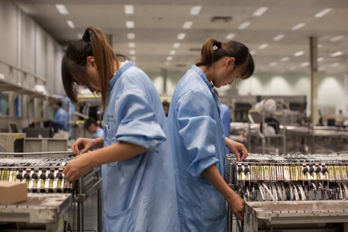 Factory workers doing quality control checks, Shanghai, China, 2012 © Olivia Arthur / Magnum Photos. Ouvrières au poste de contrôle qualité – Shanghai, Chine. « Cette photo illustre à nouveau un paradoxe : la production industrielle a été obligée d’imaginer des postes de contrôle pour vérifier la qualité des produits en bout de fabrication. Mais le travail des contrôleuses est également un travail à la chaîne, dans une tâche routinière, dos à dos et qui renvoie à l’individualisation des personnels ».