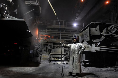 Jean-Michel, fondeur de l’aciérie de Saint-Saulve, France, 2008 © Jean-Michel Turpin – Fondeur à l’aciérie de Saint-Saulve dans le Nord. « L’ouvrier fondeur a des allures de chevalier blanc au milieu de cette aciérie, un environnement de travail particulièrement pénible et usant, avec chaleur, bruits et cadences. C’est une représentation héroïque du travail, au cœur de la transformation de la matière en objets usuels ».