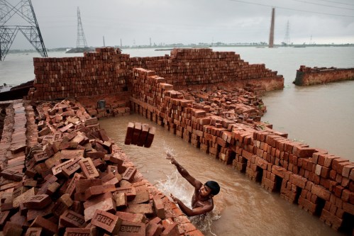 Brick kilns marooned in water, Ashulia, Bangladesh, 2010 © Jonas Bendiksen/Magnum Photos – Ouvrier bengali sortant les briques de l’eau après un orage. « Voilà un travail directement lié aux effets des bouleversements climatiques qui frappent déjà certaines zones du globe, notamment parmi les plus pauvres. Il montre l’enjeu de la redéfinition des modes de production et d’échange à l’échelle internationale, pour faire face aux impératifs environnementaux ».