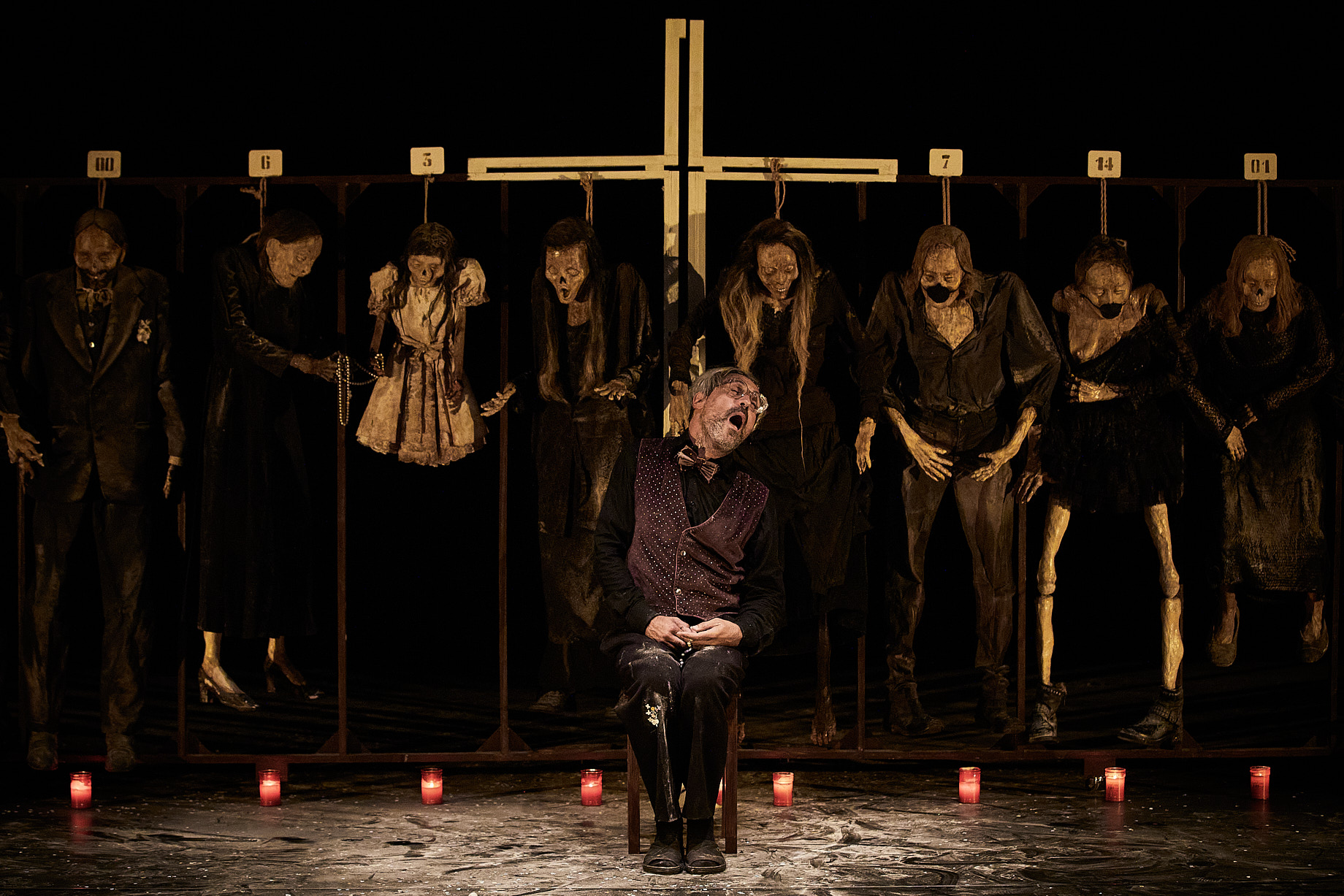 Dans Pupo di zucchero, c’est la fête des morts que l’on célèbre. Un vieil homme aux allures de Gepetto (dans Misericordia, on entend ce petit air de tarentelle du Pinocchio de Comencini) sculpte en pâte à sucre un petit bonhomme. Une offrande pour les morts. Et les morts vont s’inviter, magnifiques pantins, cadavres momifiés que l’on accrochera, un à un, sur un rail jusqu’à former un retable… Emma Dante orchestre magnifiquement les mouvements sur un plateau, elle sait faire jaillir des images, nous embarquer dans des histoires toujours bouleversantes. Ses actrices, acteurs, danseuses, danseurs, performeurs sont toujours au diapason de ses visions scéniques et mystiques. Ces deux dernières créations, au-delà de leur grande qualité artistique, soulèvent toutefois quelques interrogations… Marie-José Sirach