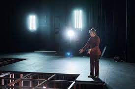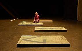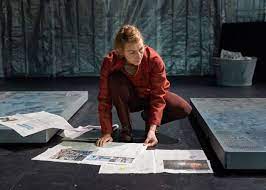 Au plateau, le déploiement se poursuit dans la scénographie d’Olivier Derousseau (avec Éric Hennaut) par une installation de caisses et palettes, deux immenses échelles inclinées comme des lignes de fuite, évoquant un paysage abstrait d’errance et de dépossession. Ce sont d’abord quatre lecteurs du groupe d’entraide mutuelle le Rebond, d’Épinay-sur-Seine, qui ouvrent le spectacle avec des extraits d’État de siège. Leur présence fragile et sincère donne le la à l’arrivée assurée de Stéphanie Béghain, veste rouge brique et pantalon marron. La comédienne (artiste associée au T2G) adresse ici simplement le texte.