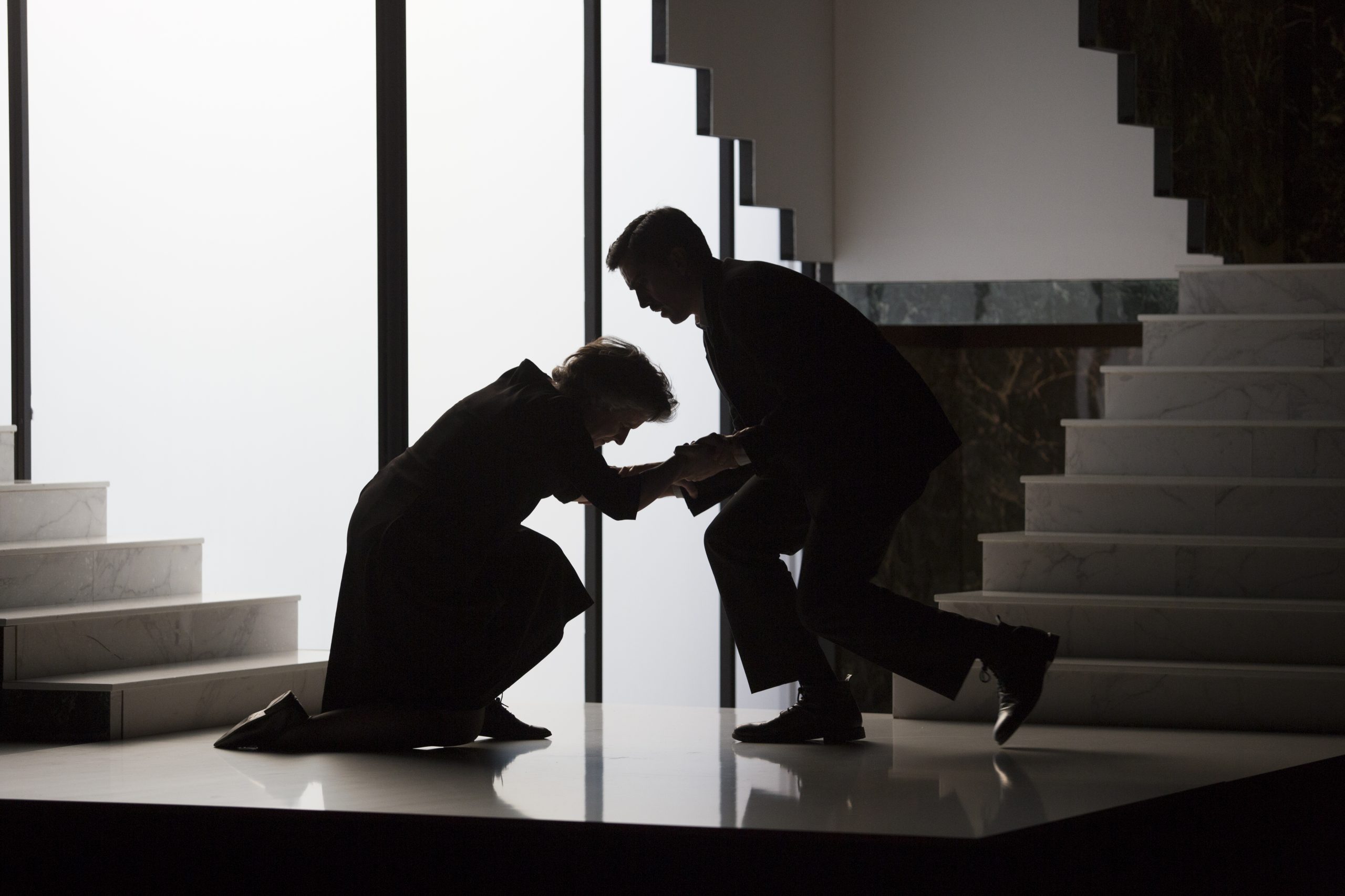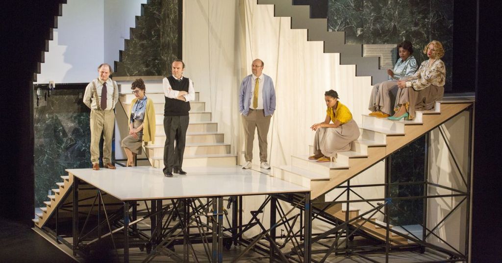 Les personnages – quatorze, resserrés à neuf – se retrouvent dans une monumentale cage d’escalier pour commenter l’arrivée d’un trio d’étrangers dont on sait seulement que leur village, au sud, a été anéanti par un tremblement de terre. Une référence à celui qui s’était produit en 1915 dans les Abruzzes, faisant quelque 30 000 morts et entraînant l’exode de nombreux déplacés. Cet escalier audacieux permet aussi bien des échappées vers les cieux que vers les combles, et donne toute sa puissance à la scénographie de Thibaut Fack. Il ferme et ouvre à la fois l’espace géographique, social et mental des personnages.