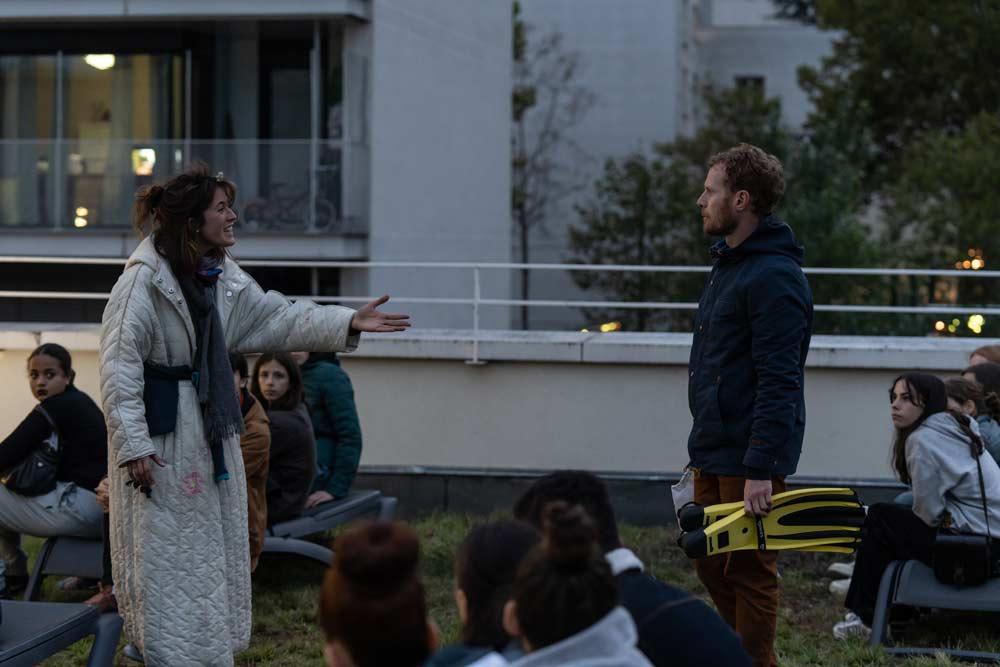 Tout commence à l’est de Paris, dans le 20ème arrondissement. Boulevard Davout, très précisément… Sur le toit de la piscine municipale, à la tombée de la nuit, se rencontrent un homme et une femme aux mines pas très engageantes : l’une aux allures de clocharde, l’autre aux intentions suicidaires ! Une entrée en matière quelque peu flippante pour ce voyage itinérant concocté par le collectif OS’O, qui nous conduira ensuite à l’inauguration d’un chantier de construction, enfin à la rencontre d’un immigré qui squatte un terrain vague. Un spectacle déambulatoire imaginé en plein confinement, qui nous invite à regarder le quartier autrement, derrière les murs à poser un regard autre sur ses habitants.
