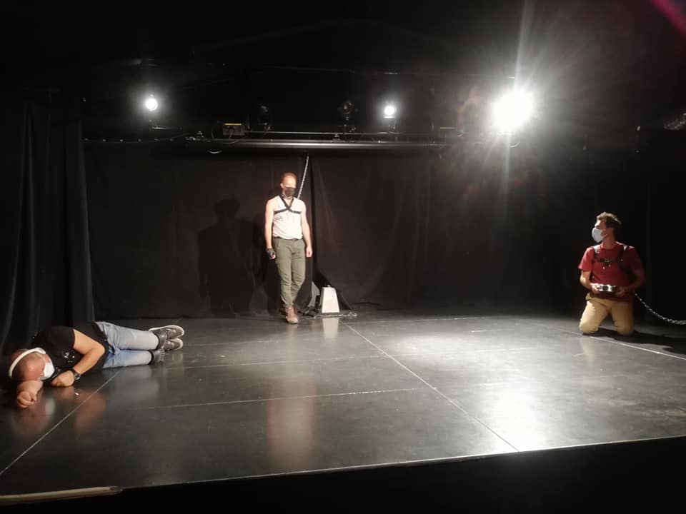 Hervé Petit (Cie La Traverse) met en scène la Paix perpétuelle, la pièce du dramaturge espagnol Juan Mayorga, né en 1965 à Madrid. C’est une fable anthropomorphe avec du mordant. Trois chiens, Odin, John-John, Emmanuel, sont en compétition pour l’obtention du collier blanc, pour l’heure en possession de Cassius (Hervé Petit), vieux clebs couturé de cicatrices, qui leur fait subir un examen. L’enjeu : intégrer une prestigieuse unité antiterroriste. À point nommé, un humain masqué (Ariane Elmerich) tient en laisse les postulants l’un après l’autre. On découvre vite l’idiosyncrasie de chacun. Odin (Nicolas Thinot), rottweiler grande gueule, vrai chien de guerre, est doté d’un flair infaillible. John-John (David Decraene), croisé entre plusieurs races, rompu à l’attaque, s’avère un peu fêlé, d’autant plus qu’Emmanuel (même prénom que Kant), berger allemand féru de philosophie (Raphaël Mondon), lui balance dans les pattes le pari de Pascal…
