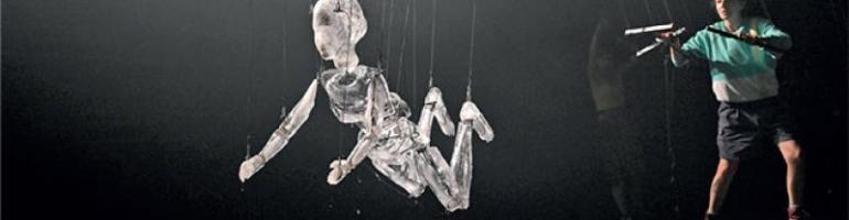 La fonte des glaces se poursuit imperturbable, l’eau envahit l’espace scénique, la marionnette hoquète en soubresauts, la figurine devient squelette et son armature fantomatiques muscles. La parole résonne telle une poétique fluctuante, clapotis verbal à l’unisson des perles liquides qui gouttent et s’égouttent en flaques lumineuses. Les pas des comédiens foulant cette mer improvisée provoquent remous et vagues, la disparition de Perceval le poète déclenche une tempête fantasmagorique : les pantins s’agitent en un ballet désordonné au bout de leurs filins, la magie opère. Visages glacés et visions littéraires s’unissent en une chaude étreinte pour ne faire plus qu’un, sombrer en un filet d’eau dans les profondeurs de notre imaginaire. Portée par cet univers d’images, sons et lumières d’une originalité époustouflante, l’empreinte indépassable de notre finitude s’épanche en fines gouttelettes de béatitude, notre peur du néant fond comme glaçon au soleil.