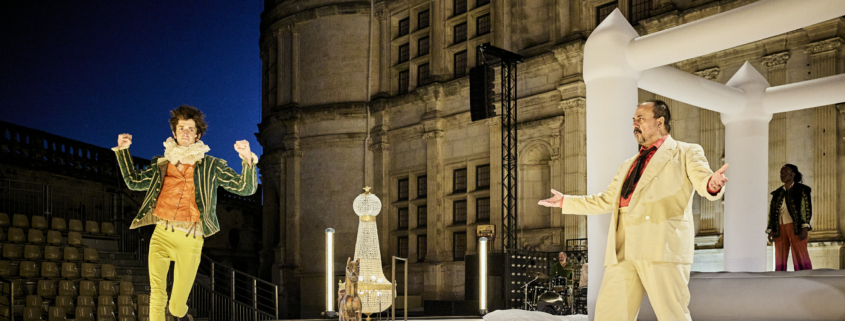 Chaque année depuis trente-six ans, propriété du département de la Drôme, le château de Grignan confie à un, ou une, metteur en scène non pas les clés mais le parvis de cette imposante bâtisse, ancienne demeure des Sévigné mère et fille, qui domine le village et offre un magnifique panorama sur les paysages alentour. La commande est simple : une pièce du patrimoine, une durée limitée, une vedette. Jean Bellorini, directeur du TNP de Villeurbanne (69), a rempli les deux premières conditions mais a choisi de distribuer les rôles aux acteurs de sa troupe qui, s’ils ne sont pas des « stars » n’en sont pas moins d’excellents comédiens. Sans aucune incidence sur la fréquentation : chaque soir, 700 personnes se pressent à l’une des 46 représentations. Soit un total de plus de 30 000 spectateurs…
