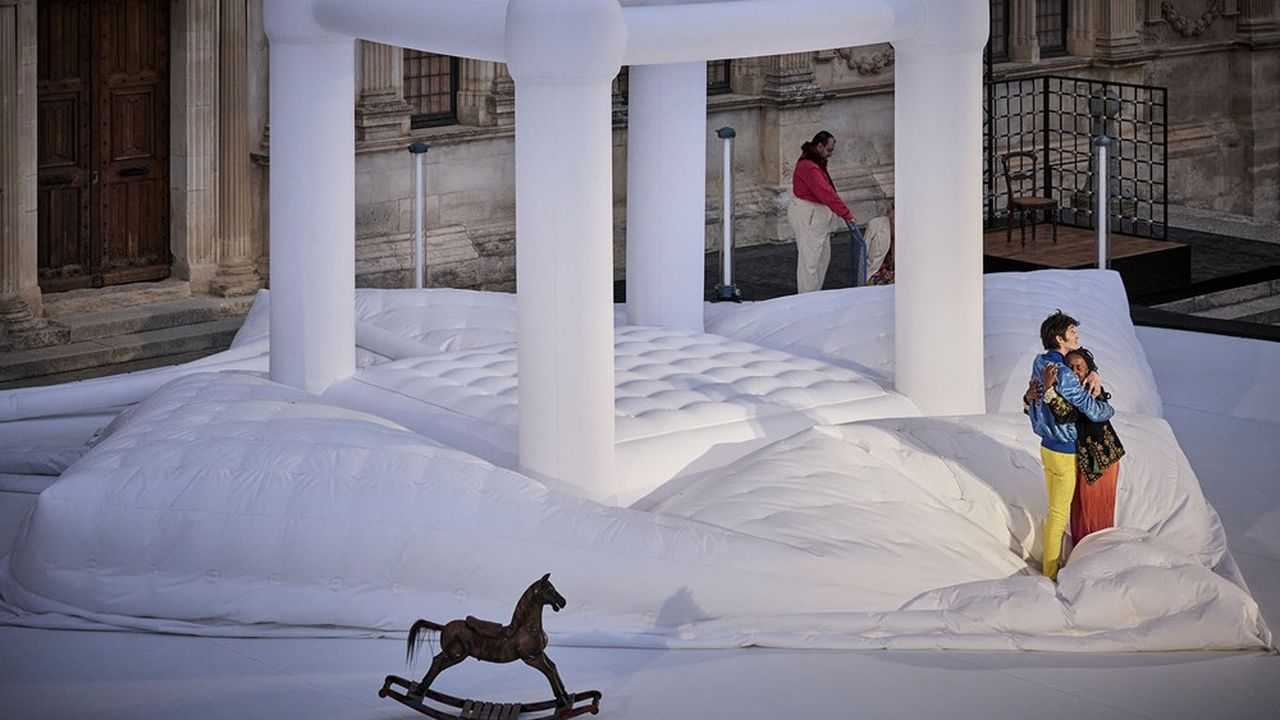 Bellorini a choisi de traiter la pièce par un montage, voire démontage, parfois un peu trop décousu du texte originel à la manière d’un conte. En guise de château en Espagne, un château gonflable où les acteurs vont jouer, sauter, danser, en équilibre constant, mais aussi un petit bateau, un cheval à bascule… Les tirades les plus connues de la pièce sont là et le public, qui connaît son Cid sur le bout des doigts depuis le collège, les murmure religieusement, de concert avec les acteurs. Bellorini a choisi l’option divertissement pour ce qui, à l’origine, est une tragédie. Et ça fonctionne : c’est ludique, joyeux et les quatre actrices et acteurs – Cindy Almeida de Brito (Chimène), François Deblock (un Rodrigue), Karyll Elgrichi (l’Infante) et Federico Vanni (Don Diègue), s’en donnent à cœur joie, épaulés par deux musiciens (Clément Griffault et Benoît Prisset). La mise en scène est loufoque et soignée, la direction d’acteurs au poil.