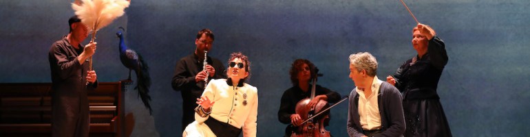 En courts tableaux et une heure cinquante, Estelle Meyer nous entraine avec élan dans la vie tumultueuse de son héroïne. D’abord elle campe une jeune première empruntée, à la voix incertaine, puis elle prendra de l’aisance jusqu’à nous faire entendre quelques morceaux de bravoure, dont une tirade de l’Aiglon d’Edmond Rostand. Sans singer son modèle, la comédienne porte avec vigueur ce personnage éruptif, volontaire dont la devise reste « Quand même », titre d’un des songs du spectacle. Mais elle ne manque pas de nuances quand elle chante la mort de sa cadette « Ma petite sœur mon amour mon cœur… ». À ses côtés, la présence discrète d’Isabelle Gardien en fidèle gouvernante apporte un contrepoint. Il faut saluer l’habileté des sept comédiennes et comédiens qui se déploient autour d’elle, se partageant une trentaine de rôles dans les somptueux costumes de Cindy Lombardi. Quelques éléments de décor et accessoires rapidement déplacés suffisent à la scénographe Salma Bordes à situer les différents épisodes, aidée par des projections vidéo suggestives.