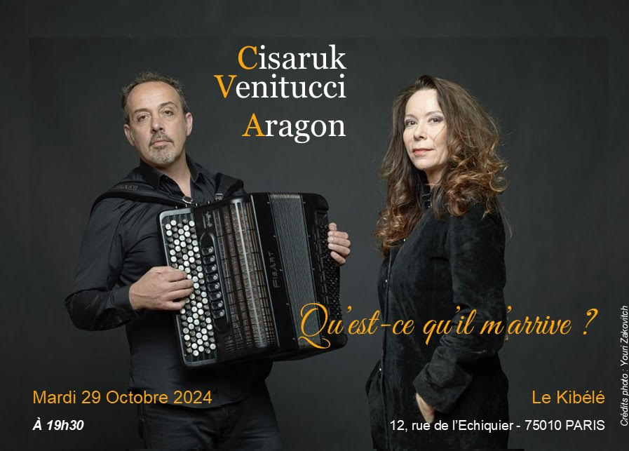 Avec Didier-Georges Gabily le grand auteur dramatique trop tôt disparu, son amour de jeunesse, la belle interprète aura découvert théâtre et littérature. En 1981, elle entre au Conservatoire de Paris. Sous la direction de Marcel Bluwal, elle joue Le Petit Mahagonny de Brecht au côté d’Ariane Ascaride, régulièrement elle foulera les planches sous la houlette de Giorgio Strehler et Benno Besson. Derrière le micro, elle fait les premières parties des récitals de Pia Colombo et Juliette Gréco. D’hier à aujourd’hui, Annick Cisaruk cultive ses talents avec la même passion. Toujours elle aura mêlé chant, théâtre, comédie musicale. Reconnaissant toutefois, sans honte ni remords, sa détestation de l’accordéon jusqu’à sa rencontre, amoureuse et musicale, avec les doigts d’orfèvre de David Venitucci ! Du classique au jazz, en passant par la variété, d’une touche l’autre, le musicien compose et libère moult mélodies enchanteresses. Depuis lors, lorsqu’il n’accompagne pas Patricia Petibon ou Renaud Garcia-Fons, Michèle Bernard à la chanson ou Ariane Ascaride au théâtre, en duo ils écument petites et grandes scènes. « Je prends tout de la vie », affirme avec conviction la fiancée du poète, « de l’Olympia au caboulot de quartier, j’éprouve autant de bonheur et de plaisir à chanter ».