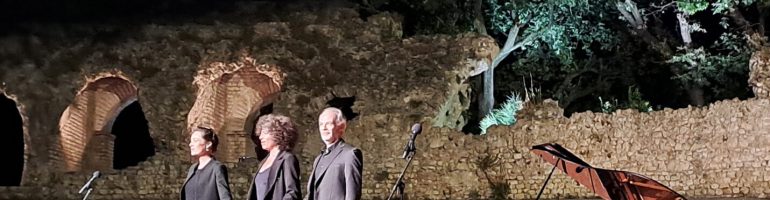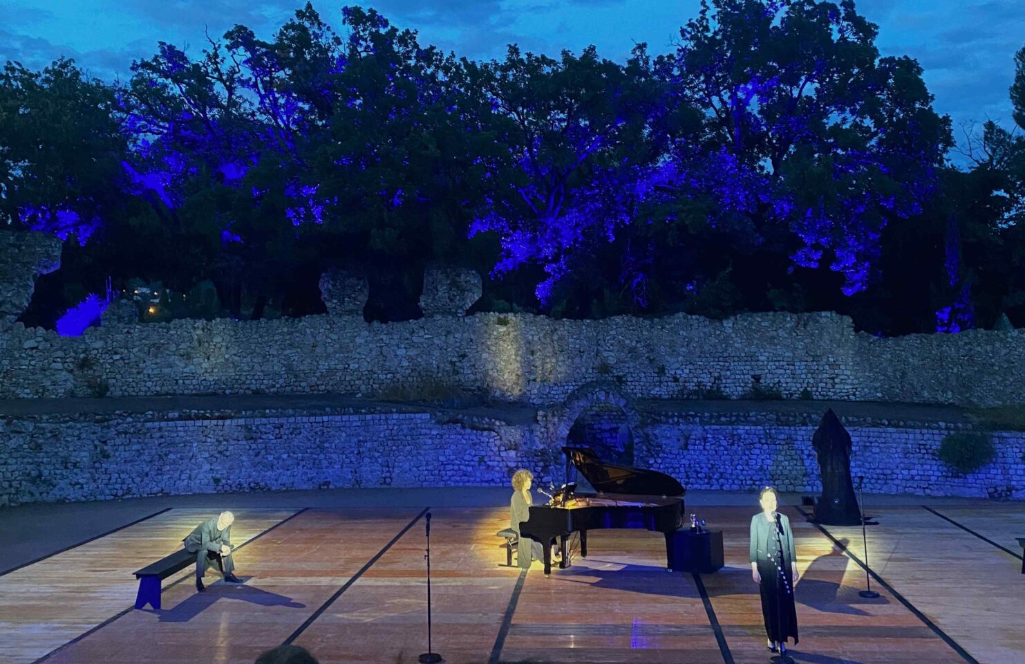 Blessé au cours de la bataille, Ménélas l’est plus encore de son amour contrarié et de la douleur qui l’étouffe depuis le départ de son épouse. Meurtri par une femme qui ne cède rien, future esclave peut-être mais toujours vaillante guerrière, « je ne me repentirai pas d’un crime que je n’ai pas commis, jamais je ne demanderai pardon ni à toi ni à aucun autre Grec », affirme-t-elle au péril de sa vie. La gloire de la victoire, la vengeance des armes, la fierté royale, la loi des puissants ? Futilités devant la perte de l’amour, de la femme de sa vie… Entre lyrisme et sensualité, un texte qui ne renie rien de la tragédie classique, une langue superbement maîtrisée, une Aurore Frémont irradiante de sensibilité, un Brontis Jodorowsky émouvant dans sa masculinité contrariée ! La pianiste rythme poétiquement le tempo de cet amour renaissant de sa chute entre blessures et fêlures : à la folie de la guerre et à la fureur des armes, sont préférables la fusion des cœurs, la passion des corps. Yonnel Liégeois