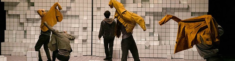 Un mur fait de cubes de céramique blanche délimite les espaces privés : café, bureau, boutiques, appartements de Jean ou de Bérenger. De l’autre côté, cavalcadent et barrissent les dangereux pachydermes, menaçant la fragile cloison d’écroulement. Loin de protéger les humains, ce décor écrasant symbolise la prolifération implacable de la « rhinocérite ». Des briques se brisent violemment au sol, des trous apparaissent dans l’édifice puis la paroi, tel un monstre, avance dangereusement en dévorant les personnages au passage. La scénographie imposante de Cerise Guyon est un terrain de jeu idéal pour la marionnettiste Bérangère Vantusso. Les cubes blancs, manipulés par les comédiens, deviennent, pour les besoins de la narration, chat, lit, miroir ou pavés que l’on s’envoie à la figure… Malgré le coup de jeune impulsé par cette nouvelle version scénique et l’énergie déployée par les interprètes, Rhinocéros reste un peu daté. La pièce semble avoir perdu l’impact qu’elle pouvait avoir à l’époque de sa création, en 1960 par Jean-Louis Barrault.