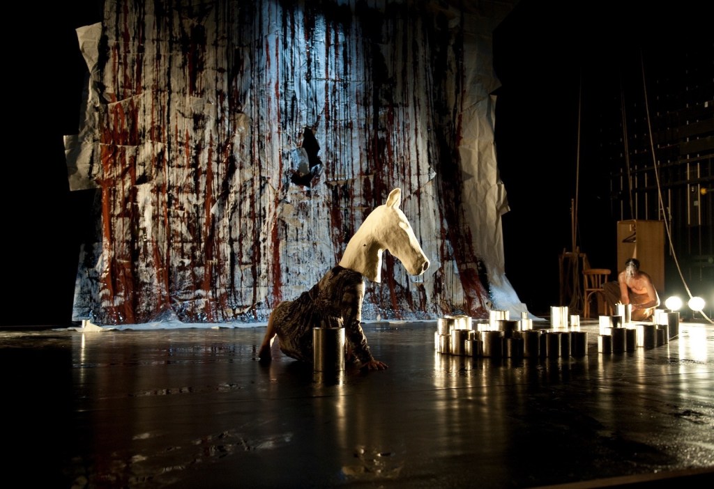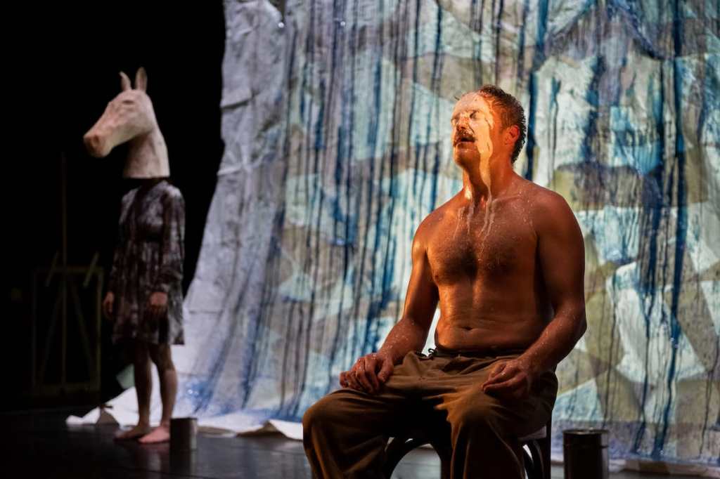 Claire Lamothe et Julien Cassier, dans un spectacle où la danse et la musique l’emportent sur les mots, sont prodigieux de virtuosité. Maîtrisant à la perfection corps et voix, forts de leur art quand il s’agit d’illustrer la faille ou la chute d’un mouvement joliment chorégraphié, une perte de voix s’éraillant au cœur d’un chant puissant : il faut être forts pour interpréter avec talent l’erreur ou la faute planifiées ! Comment ne pas perdre le nord dans un monde qui ne cesse de déraper, frise l’absurde et l’incohérence ? C’est à y laisser habits et maquillage, à défaut de son latin, tout prenant l’eau au sens propre comme au figuré. De l’humain désarticulé au corps glissant et pataugeant dans l’œil des intempéries, ne faut-il pas recouvrer la posture de l’animal, tel ce cheval à la tête iconique, un parmi d’autres éléments d’égale importance dans l’universelle nature ?