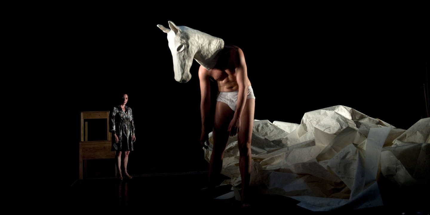 Claire Lamothe et Julien Cassier, dans un spectacle où la danse et la musique l’emportent sur les mots, sont prodigieux de virtuosité. Maîtrisant à la perfection corps et voix, forts de leur art quand il s’agit d’illustrer la faille ou la chute d’un mouvement joliment chorégraphié, une perte de voix s’éraillant au cœur d’un chant puissant : il faut être forts pour interpréter avec talent l’erreur ou la faute planifiées ! Comment ne pas perdre le nord dans un monde qui ne cesse de déraper, frise l’absurde et l’incohérence ? C’est à y laisser habits et maquillage, à défaut de son latin, tout prenant l’eau au sens propre comme au figuré. De l’humain désarticulé au corps glissant et pataugeant dans l’œil des intempéries, ne faut-il pas recouvrer la posture de l’animal, tel ce cheval à la tête iconique, un parmi d’autres éléments d’égale importance dans l’universelle nature ?