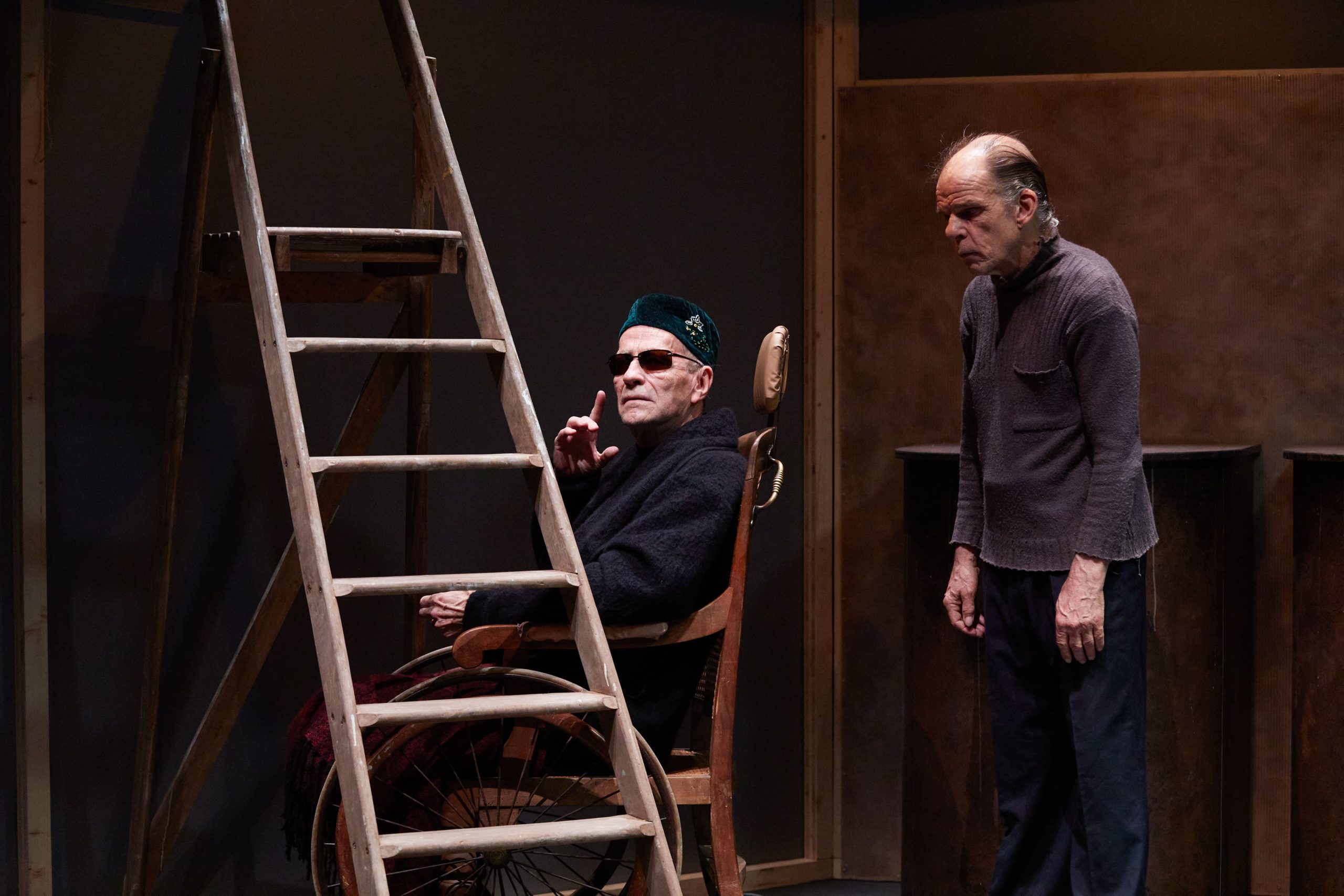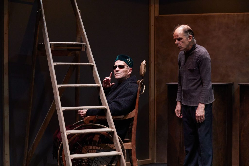 Comme l’affirme le génial irlandais à propos de sa pièce préférée, nous voilà donc face à un vieil homme condamné en son fauteuil, aveugle et paralytique… Près de lui, un type plus jeune, boiteux et agité. Hamm (Frédéric Leidgens) et Clov (Denis Lavant), le père et le fils peut-être, le maître et le serviteur plus vraisemblablement : l’un parle l’autre agit, l’un ordonne l’autre obéit. Qui s’interpellent et se répondent du tac au tac, des dialogues de basse ou haute intensité, comme Clov qui n’en finit pas de monter et descendre de son échelle, d’une aigreur vacharde ou d’une mielleuse condescendance. Le vieux, acariâtre, vit la peur au ventre, redoutant que son garçon de compagnie le quitte. L’autre, fielleux, ne cesse de répéter qu’il va fuir, s’en aller bientôt, et si ce n’est aujourd’hui ce sera demain assurément.