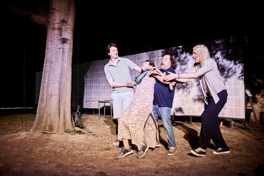 Outre une mise en scène qui fait théâtre avec presque rien, saluons la folle équipée qui squatte les planches : l’incroyable Jeanne Balibar qui fait feu de tout bois, défiant les regards pour éclairer avec force émotion la profonde et tendre humanité de son héros… La magnifique Marie-Noëlle qui se mue en convaincante narratrice… Le discret Léo Martin en fidèle assistant qui déambule manuscrit en main… Le génial Thierry Dupont, membre de la compagnie L’oiseau Mouche qui rassemble des comédiens en situation de handicap mental, qui s’affirme en merveilleux écuyer sous le nom de Sancho Panza ! Créé au Jardin de la rue de Mons lors du récent festival d’Avignon, ce Quichotte hors normes fait suite au Songe d’une nuit d’été de William Shakespeare qui l’était pas moins, mis en scène déjà en 2023 par Morin et consorts… Il est convenu par délégation expresse du maître des lieux, Tiago Rodrigues, qu’il sévisse deux années encore. Contre vents et marées, encore bien des combats à prévoir, à bousculer esprits grincheux et gardiens du patrimoine ! Yonnel Liégeois, photos Christophe Raynaud de Lage