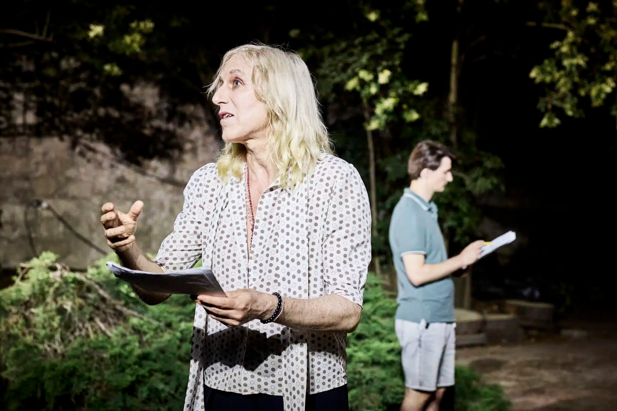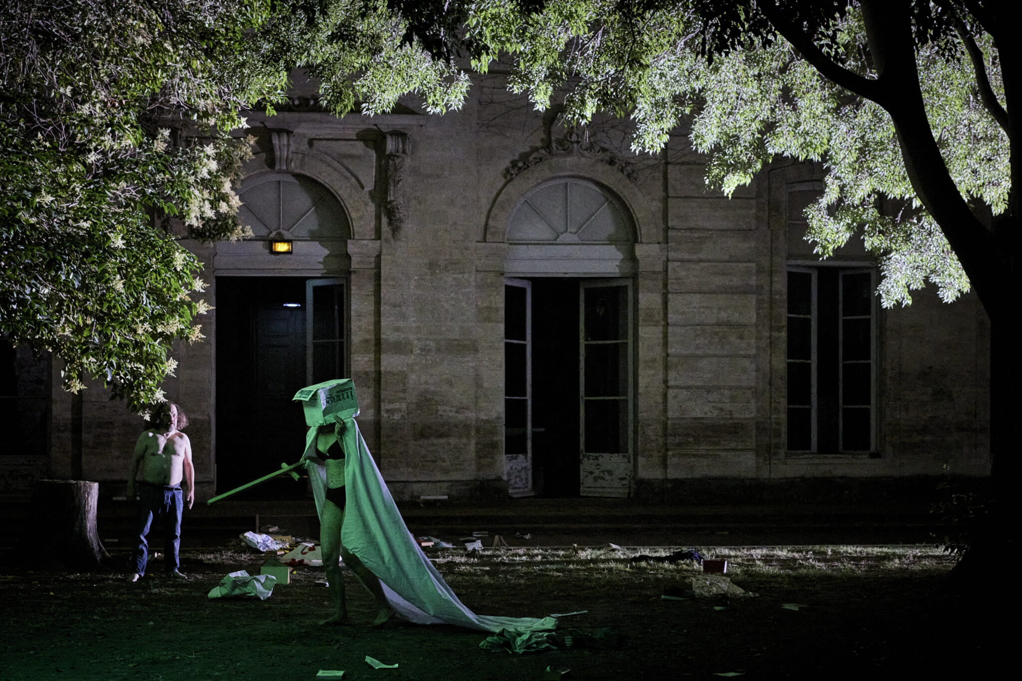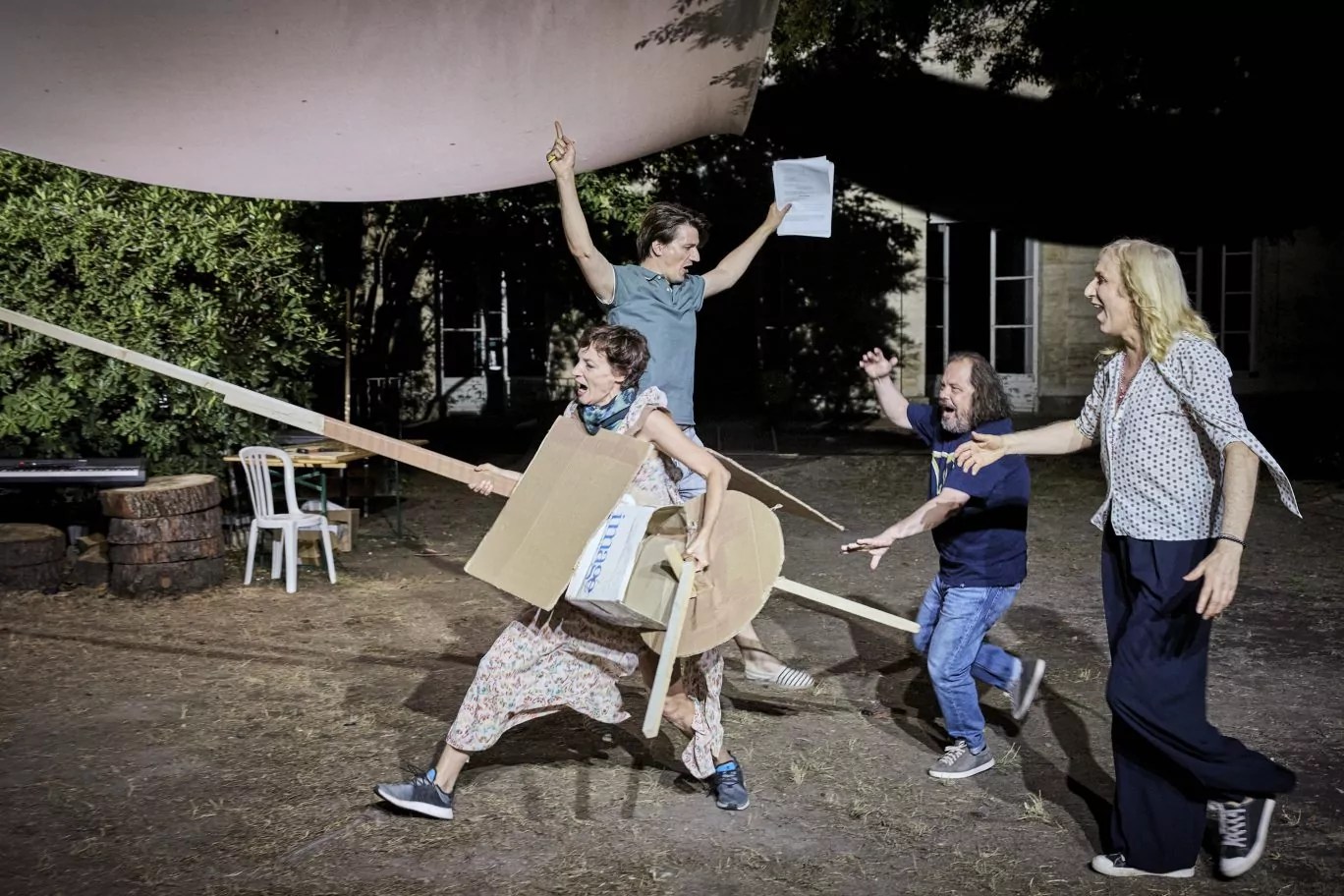Outre une mise en scène qui fait théâtre avec presque rien, saluons la folle équipée qui squatte les planches : l’incroyable Jeanne Balibar qui fait feu de tout bois, défiant les regards pour éclairer avec force émotion la profonde et tendre humanité de son héros… La magnifique Marie-Noëlle qui se mue en convaincante narratrice… Le discret Léo Martin en fidèle assistant qui déambule manuscrit en main… Le génial Thierry Dupont, membre de la compagnie L’oiseau Mouche qui rassemble des comédiens en situation de handicap mental, qui s’affirme en merveilleux écuyer sous le nom de Sancho Panza ! Créé au Jardin de la rue de Mons lors du récent festival d’Avignon, ce Quichotte hors normes fait suite au Songe d’une nuit d’été de William Shakespeare qui l’était pas moins, mis en scène déjà en 2023 par Morin et consorts… Il est convenu par délégation expresse du maître des lieux, Tiago Rodrigues, qu’il sévisse deux années encore. Contre vents et marées, encore bien des combats à prévoir, à bousculer esprits grincheux et gardiens du patrimoine ! Yonnel Liégeois, photos Christophe Raynaud de Lage