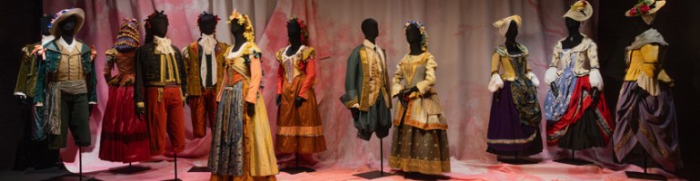 Dans chacune des vitrines, devant des toiles peintes rappelant l’univers du spectacle, les costumes présentés sur des mannequins sont mis en lumière comme pour une représentation. Ils témoignent des spectacles créés comme le Phèdre mis en scène par Anne Delbée en 1995, ou encore, en 2006, le Cyrano de Bergerac, par Denis Podalydès et la troupe de la Comédie Française. Avec quelques absents, car ils sont encore en tournée ou annoncés pour des reprises. Christian Lacroix a créé les costumes de plus de 30 productions lyriques, pour l’Opéra de Paris, le Festival d’Aix-en-Provence, le Capitole de Toulouse, l’Opéra du Rhin, la Monnaie de Bruxelles, et d’autres scènes lyriques en Allemagne, Suisse, Espagne, Chine, etc…