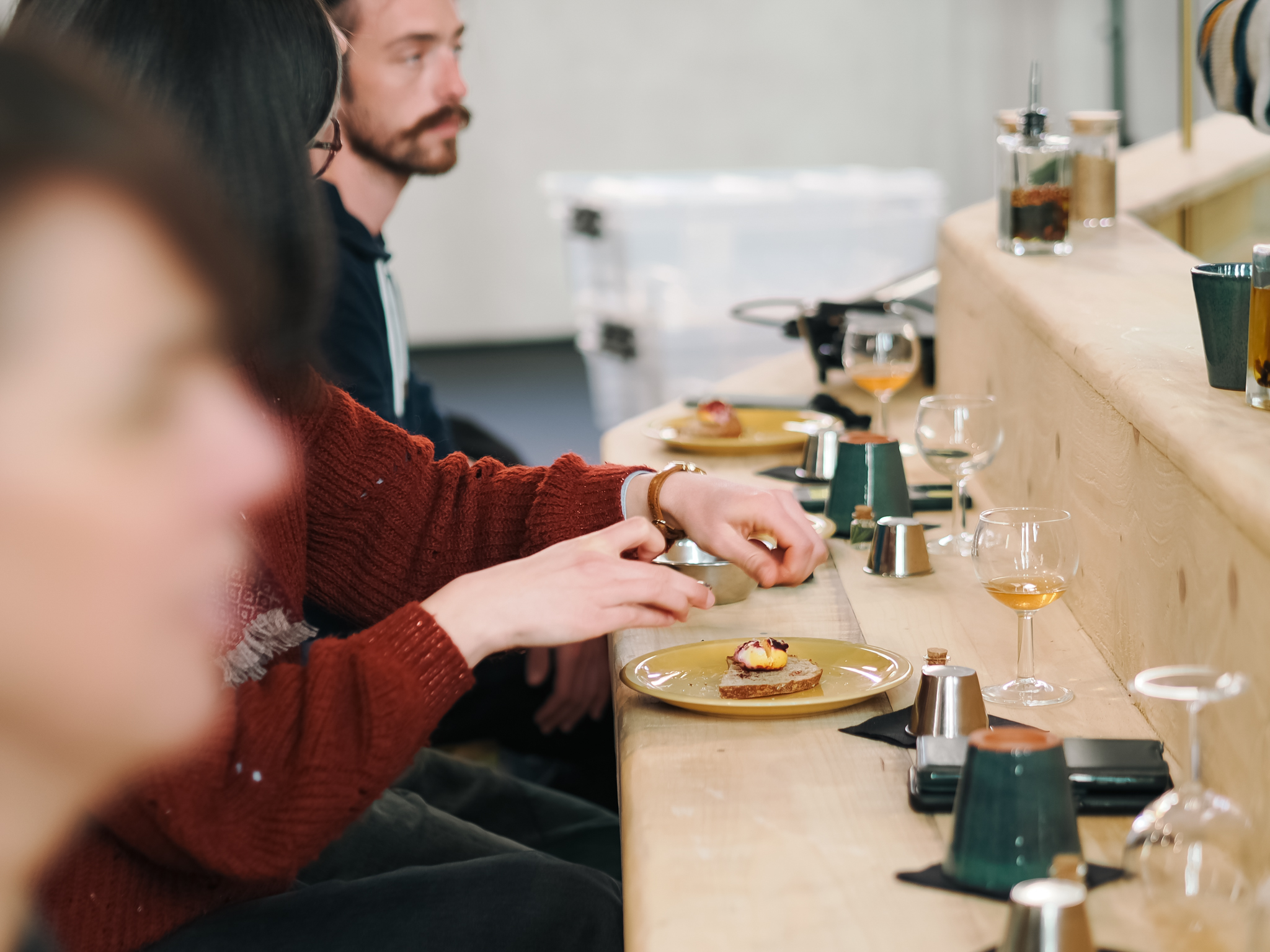 Follement alléché, succombant à la tentation, Chantiers de culture l’a testé mais aucune lubrique potion ni dessous de table ne l’obligeront à dévoiler le menu. Il restera bouche cousue, c’est la surprise de la cheffe ! Miske Alhaouthou, d’origine comorienne, mêle avec délice sucré et salé, doux ou épicé, petites gâteries et grosses bouchées. Le bonheur n’est plus dans le pré, c’est celui du palais où nez et bouche sont élus prince et princesse d’honneur, seigneurs des senteurs ! Au royaume des gourmets et gourmands, chauds ou froids défilent mets et boissons aux multiples arômes, à chacune et chacun de découvrir et savourer leur texture, leur origine, leur goût : de la betterave au chocolat, de la cardamone au piment, de la châtaigne à la noisette, des huiles diverses aux sauces colorées… Un vertige culinaire, dans la bonne humeur et la convivialité où chaque convive a droit à la parole en aparté, est incité à partager découvertes et affinités avec voisine ou voisin de tablée !
