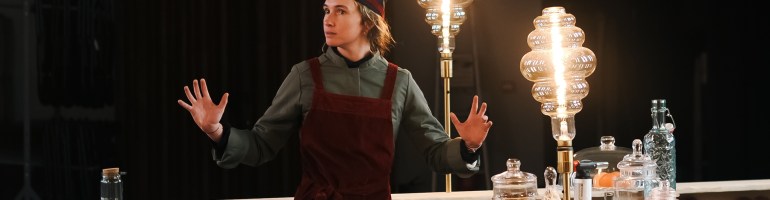 Une quarantaine de convives, ni plus ni moins… Deux longues tablées face à face, une serveuse Madame M (comme j’m la bonne chère, pas la publicité décadente de la télévision…) et un serveur Monsieur R (comme je Respire huiles et épices…), Mathilde Velsch et Robin Le Moigne en tabliers bigarrés et bizarrement toqués à la manière de tout maître aux fourneaux ! Face à chaque invité, veillent au grain verre à pied et gobelet, une belle assiette et de mystérieuses fioles en surplomb. Jouez hautbois, résonnez musettes, s’ouvre le bal imaginaire des couteaux et fourchettes. Pour et Par les bouches, la première dégustation est avancée : jeux de langues et jeux de mots vont alors s’enchaîner, près d’une heure durant.
