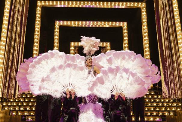 La mise en scène jette un éclairage vif sur l’homoparentalité, passé dans les précédentes lectures de la pièce pour un argument mineur. Ce qui ne faisait pas sujet alors surprend aujourd’hui par son aspect visionnaire. Alban-Zaza et Georges sont tous deux les pères de ce garçon qui s’apprête à quitter le nid familial. Interprétés par Laurent Lafitte et Damien Bigourdan, ils forment un duo chic et choc qui échappe à la caricature pour jouer la sensibilité sans pleurnicherie, la féminité loin des clichés efféminés, l’amour et les chagrins qui rythment la vie de tout couple. Pendant deux heures et demie, on nage dans la flamboyance, dans la démesure, à tout point de vue, l’émotion à fleur de larmes. Les décors, somptueux, de Pierre-André Weitz, tournent et nous projettent tour à tour au cœur du cabaret, dans les loges, les coulisses, l’appartement familial ou sur un bord de mer totalement kitsch avec des paysages peints sur toile de Saint-Tropez. Weitz a aussi dessiné les costumes, qui ruissellent de paillettes et de strass.