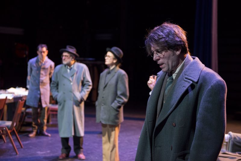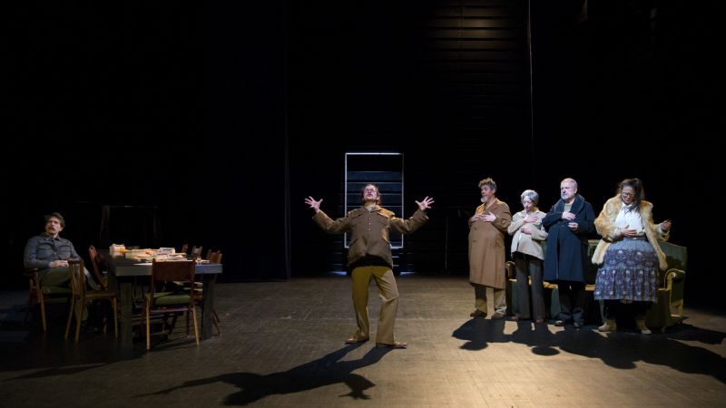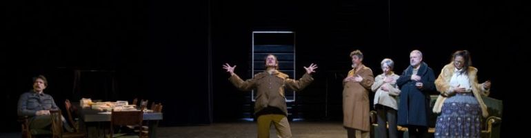 Neuf comédiens autour d’une longue table de travail nous content cette saga, passant habilement de la narration à des scènes dialoguées. Sur le plateau nu, de hauts rideaux en fond de scène, découvrent partiellement les coulisses, où costumes et accessoires sont à disposition des interprètes pour incarner les nombreux personnages qui se croisent dans le roman. Une casquette coiffe un militant bolchévik, un manteau de cuir noir habille un SS nazi, une canne souligne le grand âge et la sagesse d’un ancien menchévik, un châle et manteau deviennent les attributs d’une déportée juive… Les acteurs endosseront aussi la vareuse de Staline, des uniformes militaires, les tenues décontractées de jeunes femmes… En trois heures de spectacle, il s’agit de traverser plus de mille pages. D’un épisode à l’autre, les artistes – indifféremment hommes ou femmes – compulsent devant nous l’ouvrage de Vassili Grossman, nous guidant aux croisements d’existences bousculées et de débats passionnés.