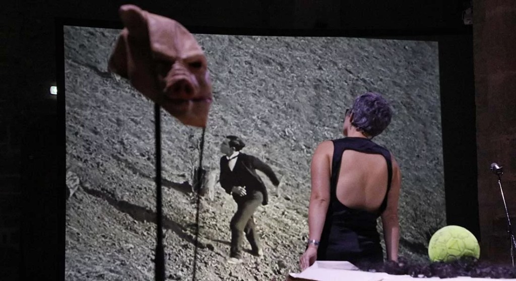 Sur le plateau, quelques tables et chaises d’école, un fauteuil, des écrans de toute taille et, au lointain, une forêt de micros : un décor simple conçu par Anaïs Pélaquier qu’elle manipule au gré des épisodes… Une présence quasi silencieuse aux côtés des acteurs Didier Menin et Camille Perrin qui est aussi, lui, à la console musique. Chacun se présente et annonce la couleur : «Les acteurs doivent citer, disait le père Brecht. » Lesquels joueront avec une juste distance les nombreux personnages. Et défilent en contrepoint sur les écrans, des extraits de films de J.L.G, interviews, photos, images d’actualité, archives… Le roman convoque aussi Jules Michelet avec, d’abord, le massacre de la princesse de Lamballe.
