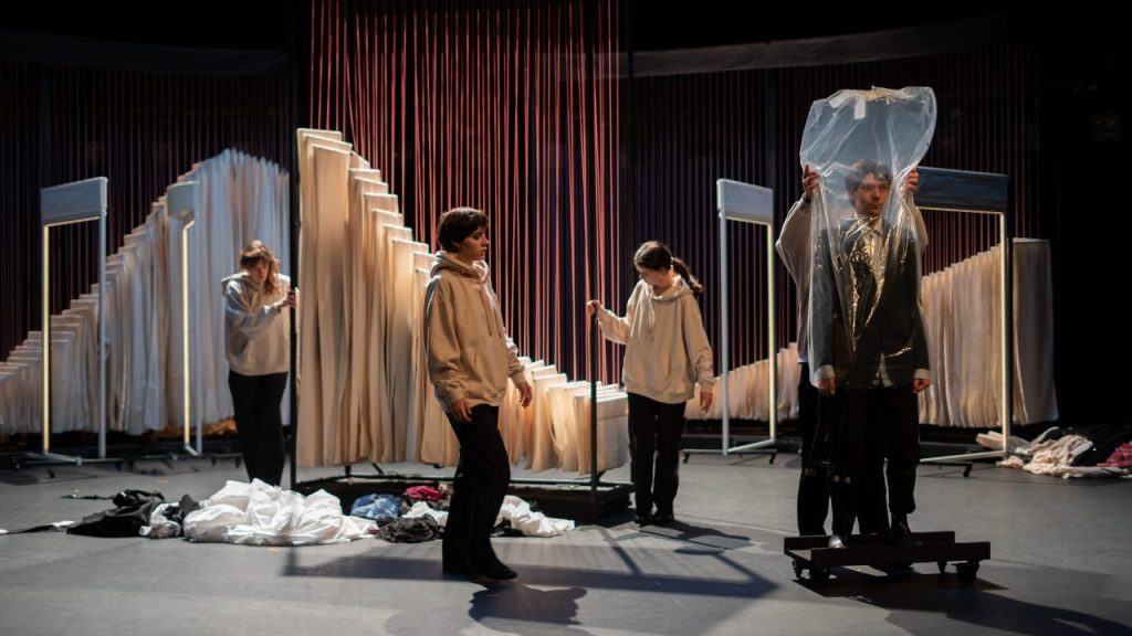 Sur la grande scène du Théâtre de Montreuil (93), ils vont et viennent, font le beau, s’habillent et se déshabillent, défilent et disparaissent. Derrière un grand rideau stylisé, sont nichés les trésors, des dizaines d’habits et de vêtements : de la bonne sœur à l’ouvrier du bâtiment, de la blouse d’école au jogging du sportif… Les cinq garçons et filles paradent avec adresse et précision, jeunes et tous élèves de la Jeune Troupe du Théâtre Olympia, le Centre dramatique national de Tours dirigé par Bérangère Vantusso.