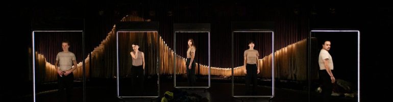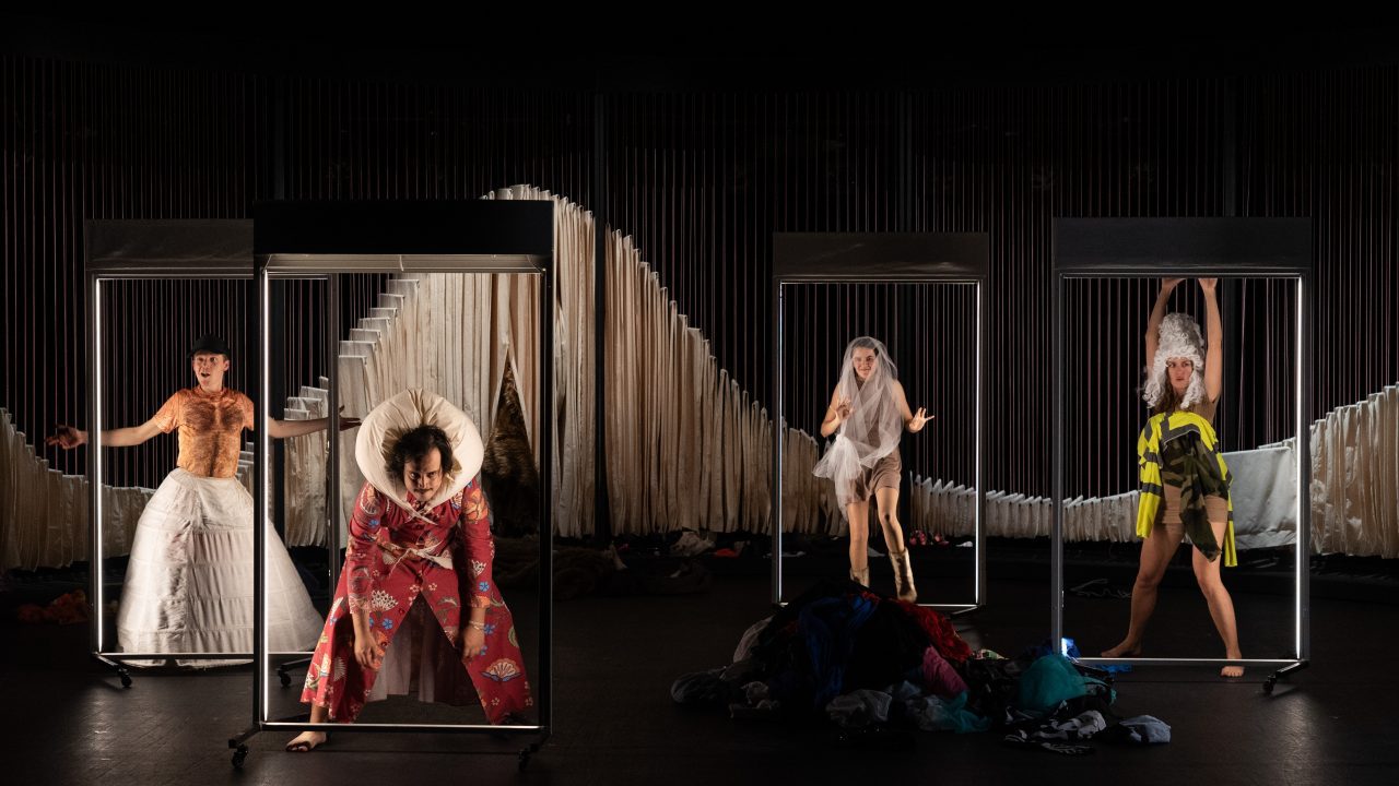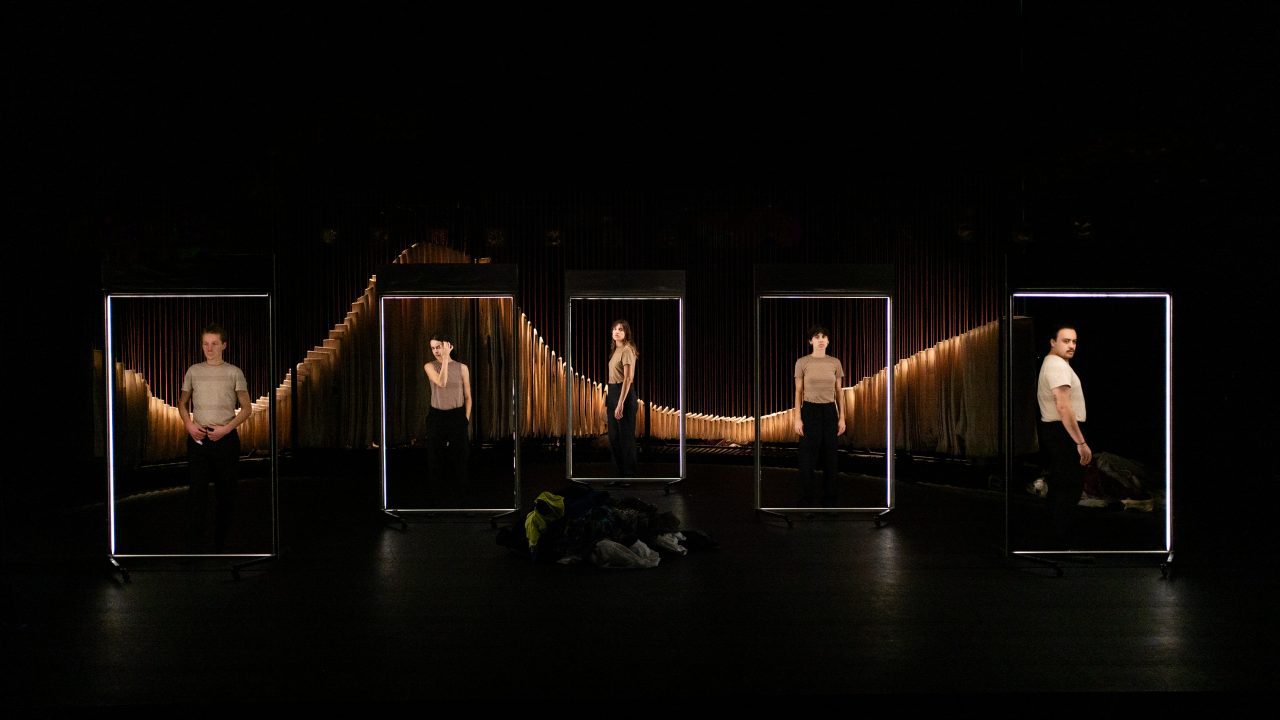 Sur la grande scène du Théâtre de Montreuil (93), ils vont et viennent, font le beau, s’habillent et se déshabillent, défilent et disparaissent. Derrière un grand rideau stylisé, sont nichés les trésors, des dizaines d’habits et de vêtements : de la bonne sœur à l’ouvrier du bâtiment, de la blouse d’école au jogging du sportif… Les cinq garçons et filles paradent avec adresse et précision, jeunes et tous élèves de la Jeune Troupe du Théâtre Olympia, le Centre dramatique national de Tours dirigé par Bérangère Vantusso.