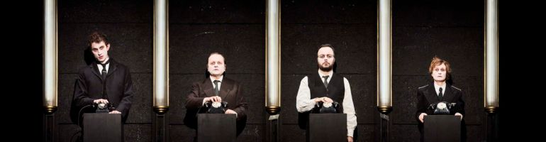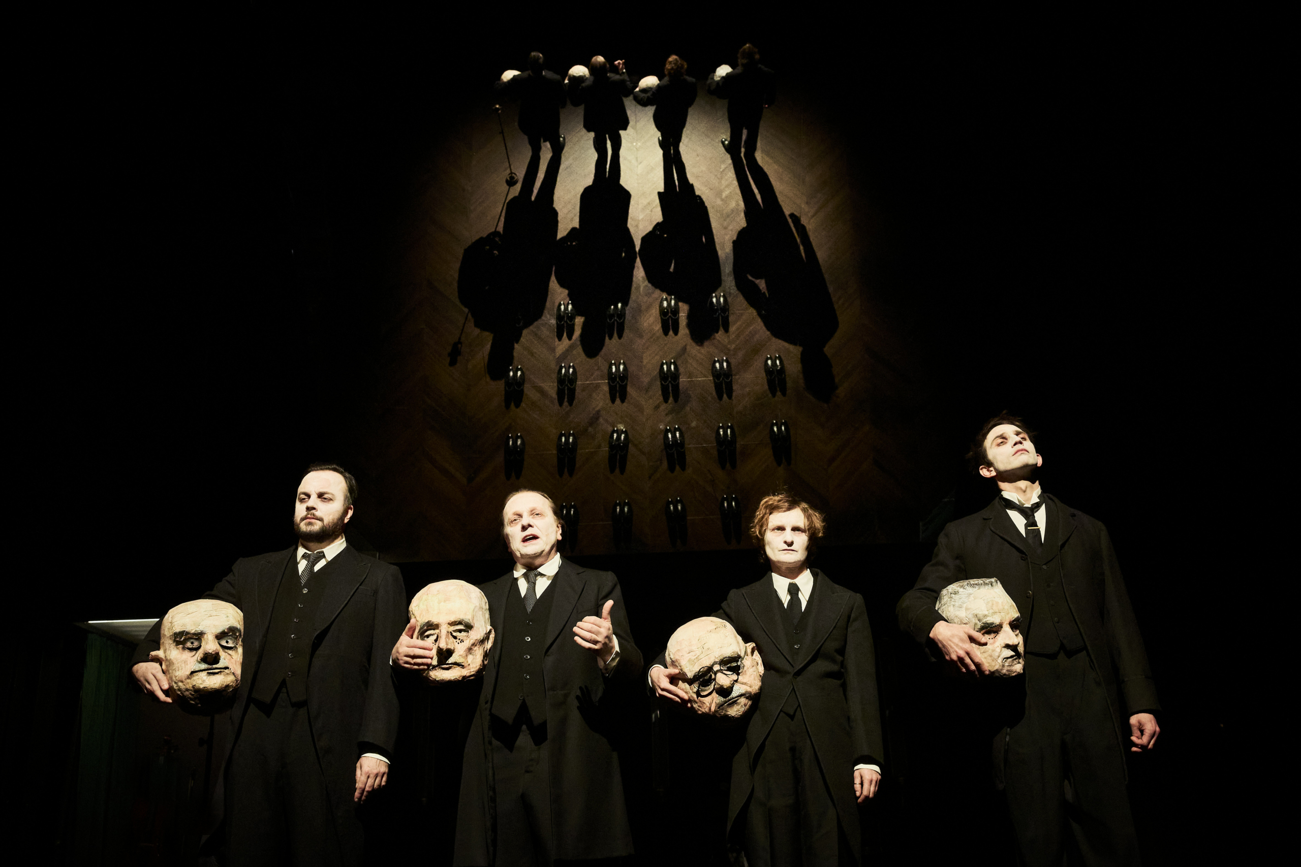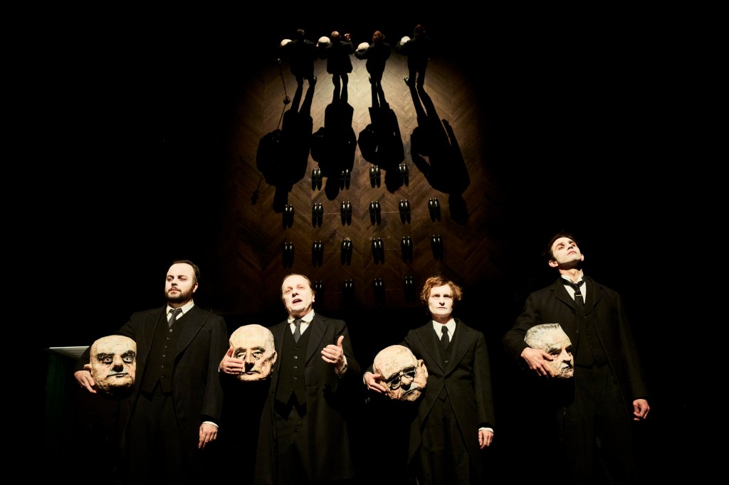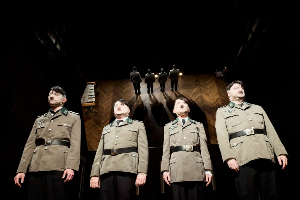 A la fois narrateurs et protagonistes, entre scènes dialoguées et récits, Laurent Stocker, Julie Sicard, Jérémy Lopez, Baptiste Chabauty font entendre cette triste saga. Ils sont tour à tour les grandes figures historiques de cette période cauchemardesque entre 1933 et 1938, à l’orée de la Seconde Guerre mondiale : Goering, Hitler, Ribbentrop, Chamberlain, Sir Cadogan Goering, Ribbentrop, Alderman Mussolini Chamberlain, Daladier… Pour ce récit choral, un jeu de masques, maquillages, coiffures conçus par Cécile Kretschmar. Elle a réalisé plusieurs types de masques qui se superposent comme autant de mues de serpent. Une tête en papier mâché un peu plus grosse que nature recouvre, par exemple, un masque en silicone puis un troisième en tulle, seconde peau plus réaliste mais tout aussi étrange. Costumes, maquillages et artéfacts sophistiqués qui tendent vers l’expressionnisme dans l’esprit du cabaret des années 1930, sont aussi terrifiants que les carnavalesques et rudimentaires grosses têtes en papier mâché. On pense à Guignol, aux caricatures de Daumier, ou au Dictateur de Charlie Chaplin et aux Producteurs de Mel Brooks …