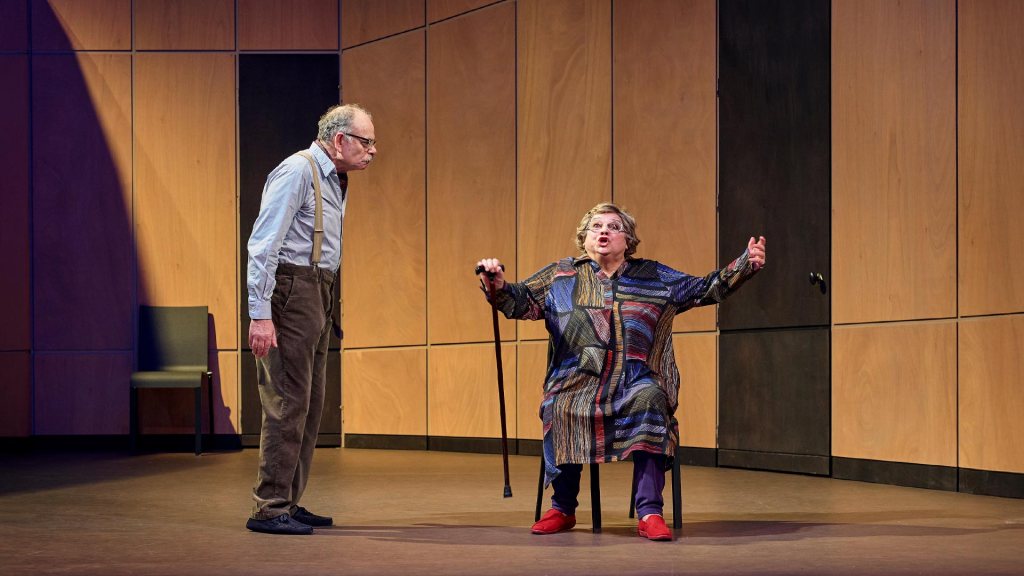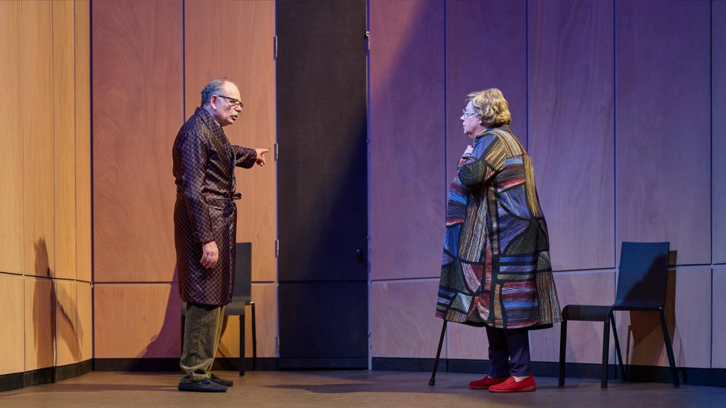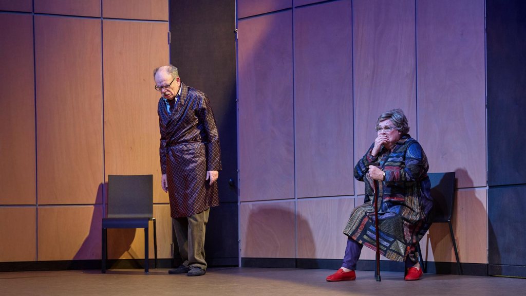 Il est donc revenu, l’enfant prodigue qui n’est plus un gamin. Pourquoi et depuis combien de temps : quelques jours, plusieurs semaines ou des années ? Nous ne le saurons jamais, nous ne l’entendrons ni le verrons jamais. Le dialogue s’éternise entre les parents. Qui se disputent, « mais parle-lui donc ! Mais non, toi », l’un frappe à la porte, l’autre y dépose le bol de soupe… Sans réponse, le silence. L’inquiétude unit le vieux couple, envahit le plateau. De querelles en chamailleries à l’évocation d’une vie commune plus terne qu’épanouissante, l’humour fait place à l’angoisse. Jean-Pierre Darroussin et Christine Murillo sont fabuleux de naturel en cet univers clos, cernés voire emprisonnés entre les hauts murs du couloir qui ferment l’angle sur la porte du fond. La mère balance entre irritation et humour lorsqu’elle débranche son appareil auditif pour ne plus rien entendre, le père entre reproches et regrets dans un long monologue chargé d’émotions.