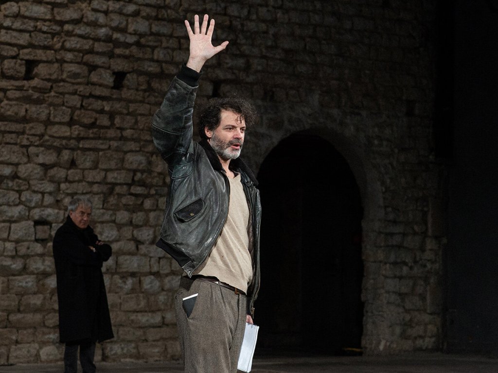Face au public, l’immense plateau du théâtre de pierre, une puissante muraille percée de trois ouvertures en belle ogive qui s’enflammeront de couleurs rougeoyantes au fil de la représentation, rien que çà et c’est déjà beaucoup… Des gradins, descendent et montent les interprètes, d’autres s’éclipsent par les portes latérales, des mouvements à la symbolique épurée, avec Sobel chacune et chacun parent à l’essentiel : la profération du verbe, en solo ou en dialogues d’une haute intensité ! Renié, rejeté par les siens, il se raconte qu’Empédocle le philosophe s’est jeté dans les flammes de l’Etna. Non par dépit ou déception, pour l’amour de la vie et de la liberté.
