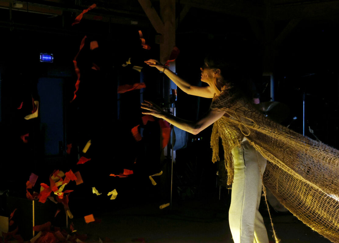De quoi accouchera ce vieux monde ? Femme qui sait ce qu’enfanter veut dire, tel un cheval fou dans un jeu de quilles, la nouvelle Don Quichotte caracole en vue d’improbables perspectives plus réjouissantes. Petits papiers multicolores lancés en l’air, personne pour venir les cueillir en plein vol, faibles lumières d’Hervé Audibert qui progressivement s’étiolent, plus noire encore la chute au sol ! Un cri désespéré, voire désespérant, qui se veut pourtant « soliloque adressé aux étoiles » confesse l’interprète, visage et mains rougis sang. Au final, on peine à croire au possible avènement d’un homme nouveau. Un spectacle d’une étrangeté absolue, aussi tragique que poétique, qui met à nu nos errances et nos failles, interpelle le futur. De catastrophe en déraison, grand est le risque que les trompettes de l’espoir se muent en trompettes de Jéricho. Que le jour, c’est comme ça, ne devienne éternelle nuit ! Yonnel Liégeois