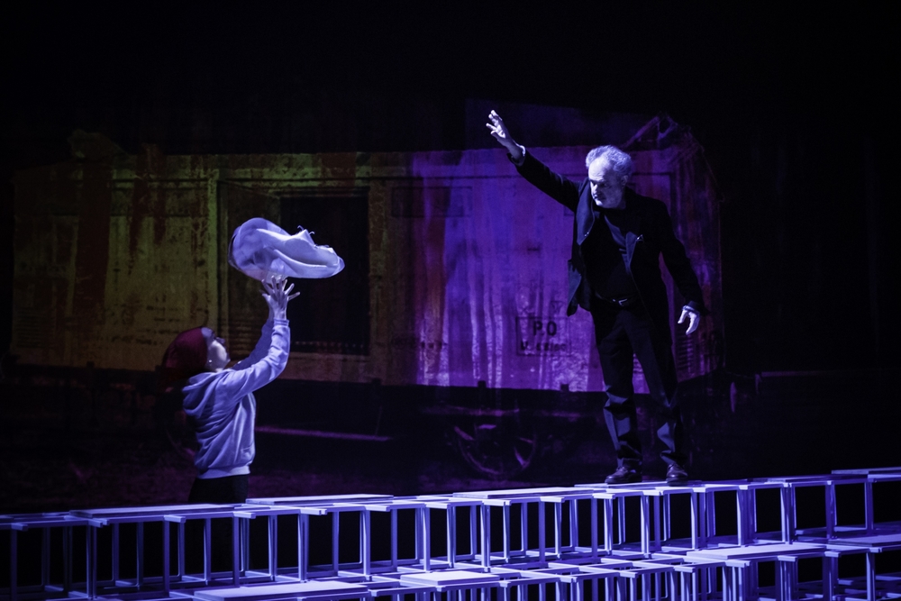 Au plateau, le déploiement se poursuit dans la scénographie d’Olivier Derousseau (avec Éric Hennaut) par une installation de caisses et palettes, deux immenses échelles inclinées comme des lignes de fuite, évoquant un paysage abstrait d’errance et de dépossession. Ce sont d’abord quatre lecteurs du groupe d’entraide mutuelle le Rebond, d’Épinay-sur-Seine, qui ouvrent le spectacle avec des extraits d’État de siège. Leur présence fragile et sincère donne le la à l’arrivée assurée de Stéphanie Béghain, veste rouge brique et pantalon marron. La comédienne (artiste associée au T2G) adresse ici simplement le texte.