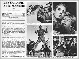 Encore étudiant, il fut découvert par Henri Aisner, à la recherche d’un jeune comédien qui ne parût pas issu de milieux bourgeois, pour un film commandé par la CGT. Les Copains du dimanche fut ainsi tourné en 1956, au lendemain de l’invasion de la Hongrie par les chars soviétiques et du rapport Khrouchtchev dénonçant les crimes de Staline. Confrontée à une forte baisse de ses adhérents, la CGT voulait que ce film constitue une propagande en faveur des comités d’entreprise, encore peu développés dix ans après leur création. Jean-Paul Belmondo incarna un ouvrier métallurgiste de dix-huit ans, ayant perdu son père à la guerre, travaillant 55 heures par semaine et habitant avec sa mère en banlieue ; son seul luxe : une guitare. Entraîné par un camarade dans la création d’un aéroclub ouvrier, le personnage se range du côté d’une jeunesse ouvrière honnête, laborieuse, solidaire, opposé à une jeunesse dorée, oisive et immorale. Le film décrit le double piège de division syndicale et de récupération patronale pour conclure en exaltant la force de l’union des syndicats et des générations.