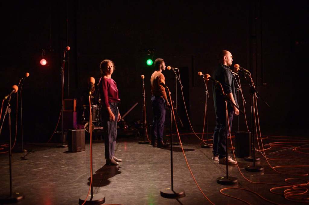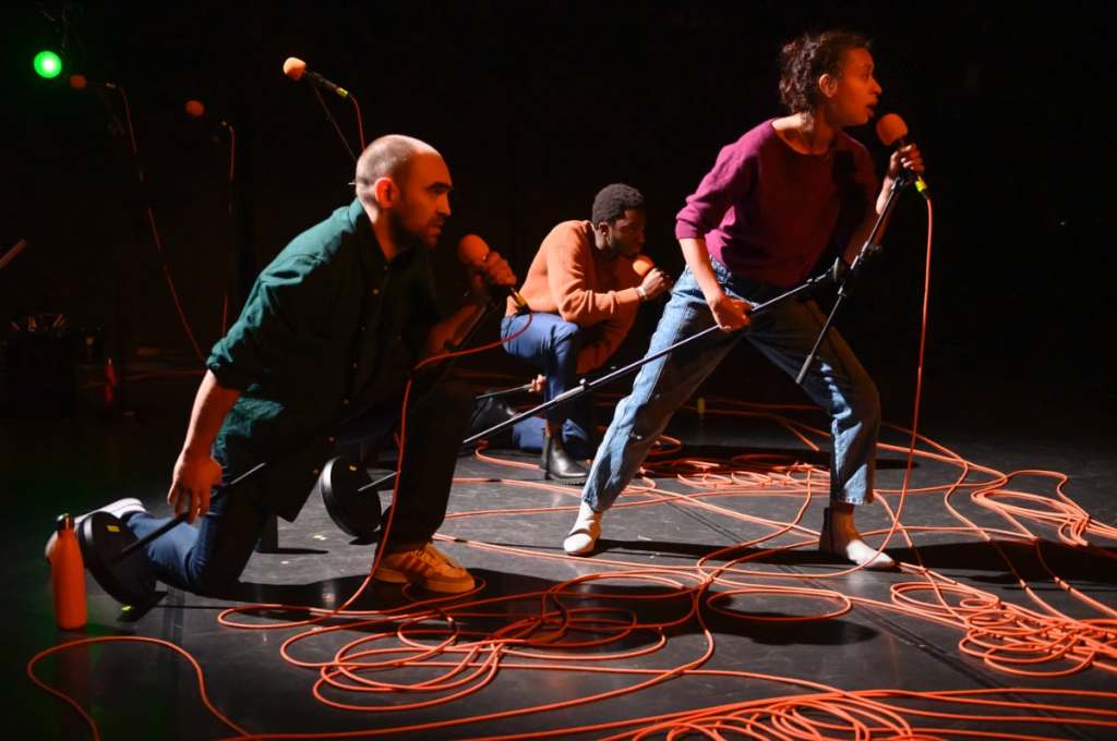 Pour tout décor une forêt de micros haut perchés, en fond de scène un comédien-technicien-musicien ( Fred Costa) s’active entre lumières, bruits et sons. Sur les planches du théâtre Jean Vilar de Vitry, pas encore chahutés par les vagues de la haute mer, s’embarquent trois matelots peu ordinaires. Bénévoles engagés dans une mission humanitaire à grands risques, ils changeront de rôles au fil de la représentation : membre d’équipage, secouriste, capitaine, journaliste… Embarquement terminé, destination la mer Egée, et vogue la galère ! Avec force convictions et dotés d’une folle énergie, les trois comédiens (Saabo Balde, Jonathan Heckel, Lymia Vitte) nous content de la voix et du geste cette dernière mission de l’Aquarius à l’heure où les autorités italiennes lui refusent le droit de débarquer les centaines de rescapés à son bord.