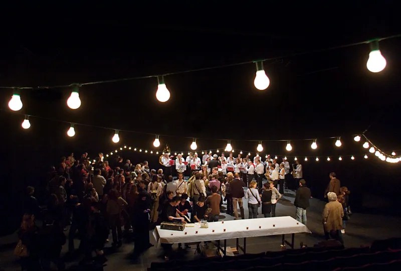 Le 26 juillet, j’étais à Bussang où le Théâtre du Peuple propose une mise en scène de Sylvain Maurice du Roi Nu d’Evguéni Schwartz (1896-1958) que j’avais traduit, il y a quasiment vingt ans, pour Laurent Pelly (…) Le Théâtre du Peuple – Maurice Pottecher fête son jubilé, ses 130 ans – cent trente ans de ferveur, de cette grande utopie réalisée (et donc pas une utopie mais une réalité), d’un théâtre fait par les gens du pays, – 130 ans de théâtre populaire. Partout, il y avait des petites annonces, des affiches, des petites guirlandes qui entouraient les tilleuls de l’allée (…), « Jubilons ».