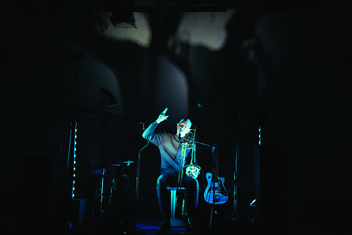 Un récital où mots et notes se mêlent et s’entremêlent quand le musicien disparaît derrière son imposant tuba, quand les jeux de lumière et d’ombre transforment guitares et trombone en spectres vivants… Ce n’est plus de la musique seule, ou de la récitation textuelle en solitaire, c’est un concert inattendu où parole et musique s’accouplent avec frénésie entre jazz, rock et pop, une jouissance orgiaque entre strophes déclamées et lignes mélodiques. De la poésie vivante dont on s’abreuve, bouche et oreilles, un spectacle total entre la vie et la mort, entre pensées moribondes et rage de vaincre. Un spectacle d’une rare puissance, d’une incroyable beauté entre récital poétique et concert symphonique, à ne pas manquer ! Yonnel Liégeois