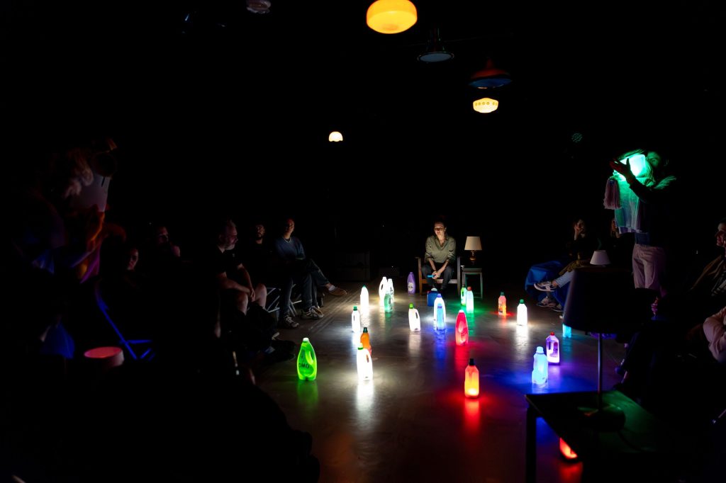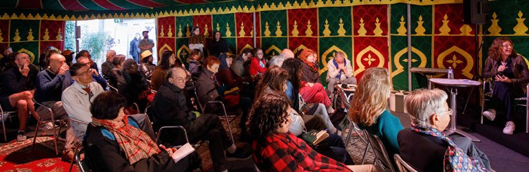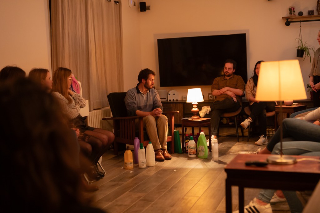 Deux-trois tables basses avec leurs jolies lampes de chevet, tout autour des chaises éparpillées dans le salon, dans un coin un imposant fauteuil d’un vert criard… L’ambiance est calme, détendue, le public s’installe avec curiosité. Plongée dans une intimité sereine, quelques places demeurent libres, réservées probablement aux hôtes des lieux !