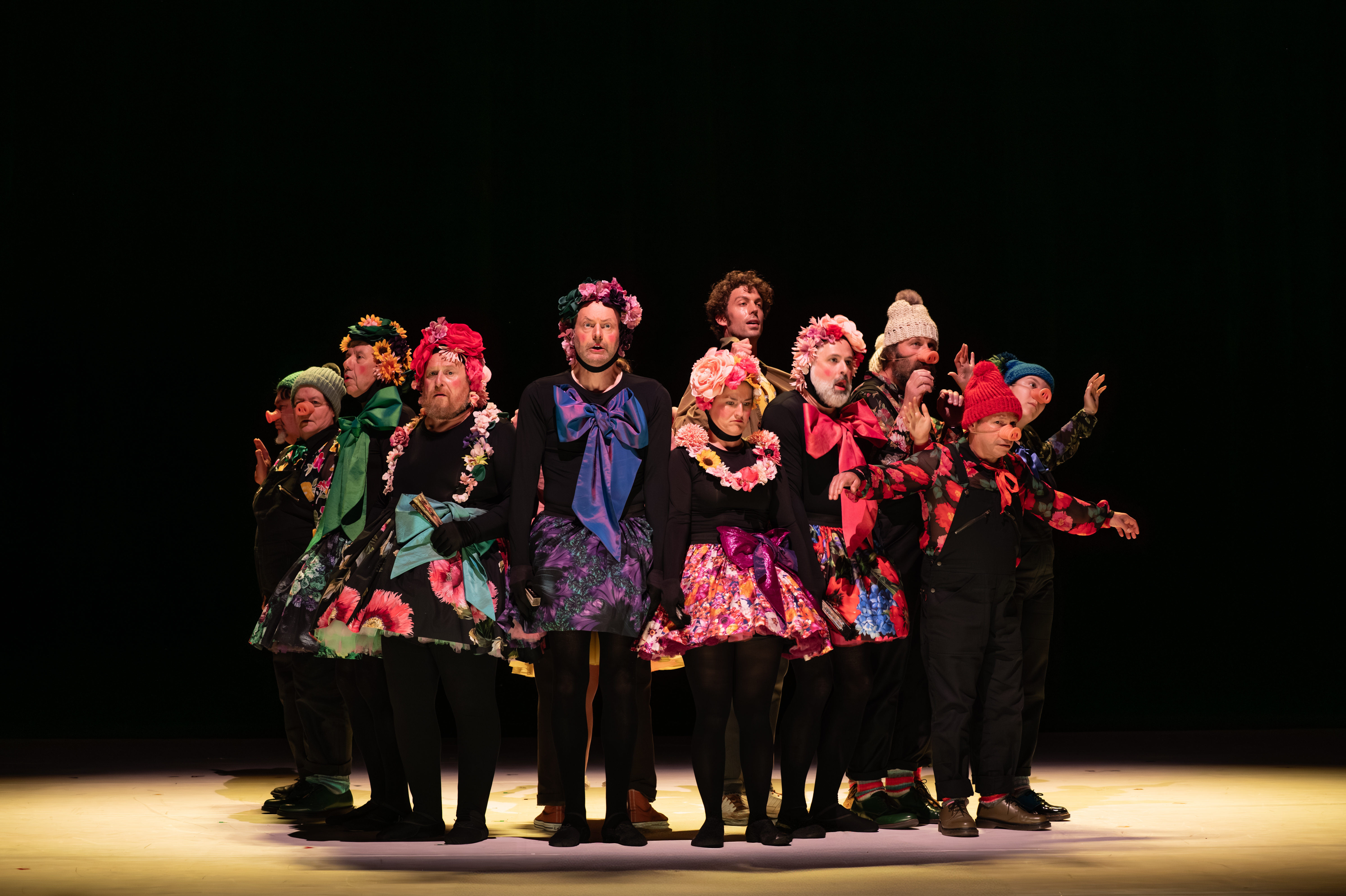 Le metteur en scène Sylvain Maurice prend l’argumentaire au pied de la lettre. Une bouffonnerie, ce Roi, qui s’affiche grandeur nature sur le vaste plateau du Théâtre du Peuple. Le ton est donné d’entrée, lorsque la troupe de comédiens envahit l’espace, chacune et chacun affublés d’un groin du plus bel effet ! Une bouffonnerie donc, certes, mais pas que… Derrière le rire bienvenu et partagé par le public d’emblée conquis, avance masquée une satire impitoyable des rapports sociaux, la soumission d’un peuple aux desiderata complètement déjantés d’un despote qui n’aspire qu’à assouvir de vulgaires penchants, entouré d’une cour où courtisans- ministre des bons sentiments-général et bourgmestre ne sont que pleutres et pitoyables flatteurs. Un pays où l’on brûle tous les ouvrages, même les livres de cuisine, où la bêtise a force de loi quand on décrète que le « juif » est banni hors du royaume alors que « l’hébreu » y est bienvenu !