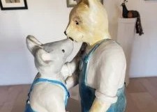 Une fois quitté les œuvres accrochées aux murs, la déambulation entraîne le visiteur à proximité des sculptures en céramique d’Isabelle Prost. Des animaux criants de vérité, le regard attiré par ses statuettes « kiss,kiss ». Une façon de montrer qu’il n’est pas d’ennemis irréconciliables. « Loup-brebis », « Chien-lièvre », « Chat-souris », se bécotent sous des apparences quasi humaines. Isabelle Prost, artiste sculptrice, expose ses œuvres dans son atelier « Cut garden » (jardin mignon en anglais), à Lusignan dans la Vienne.