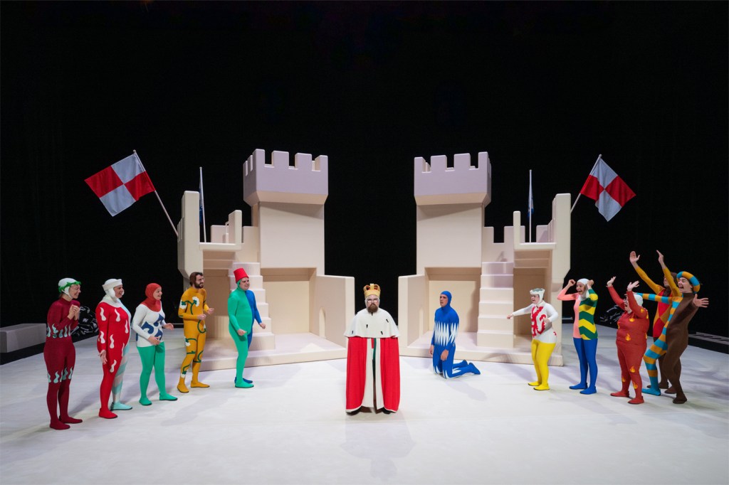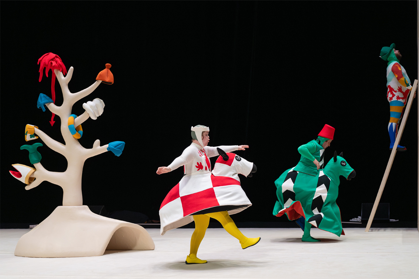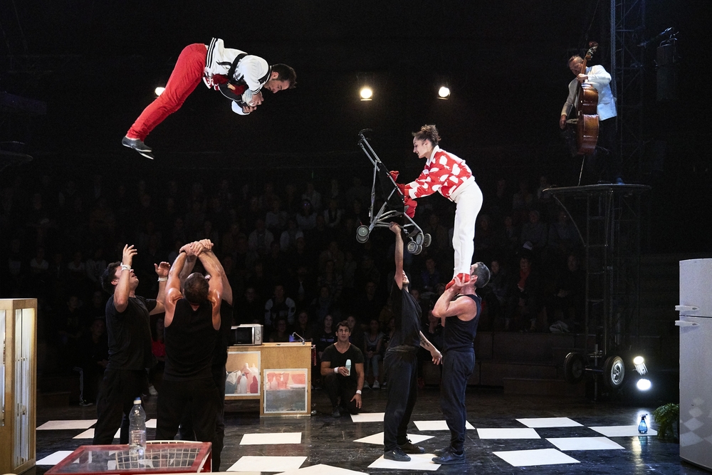 Les autres acrobates de la troupe, Romain Vigier, Maxime Solé, Basile Narcy, Maxime La Sala, Pedro Consciência (ou Tom Bruyas), Joan Ramon, Graell Gabriel, loin de jouer les utilités, comme l’on dit des soubrettes du théâtre « de boulevard », composent tout un petit peuple qui réalise des numéros de haut vol. C’est le cas de le dire, tant ils glissent dans l’espace, avec une grâce magique. Partie intégrante du spectacle, on soulignera la partition jouée en direct, et avec autant de bonne humeur, par Stephen Harrison (contrebasse), Gaël Guelat (batterie, percussions, guitare), Robin Mora (saxophone), Johann Chauveau (clavier, flûte). Si Elle et Lui s’envoient en l’air dans un ballet des plus aériens, précisons-le, ils n’en conçoivent pas moins un bébé, puis deux, dans cette féerie ménagère improbable mais d’une efficacité et d’une drôlerie à couper le souffle. Tous participent à l’aménagement de la maison. L’installation de l’électroménager est à lui seul une perle de drôlerie réglée au millimètre près. L’art de la piste est respecté.