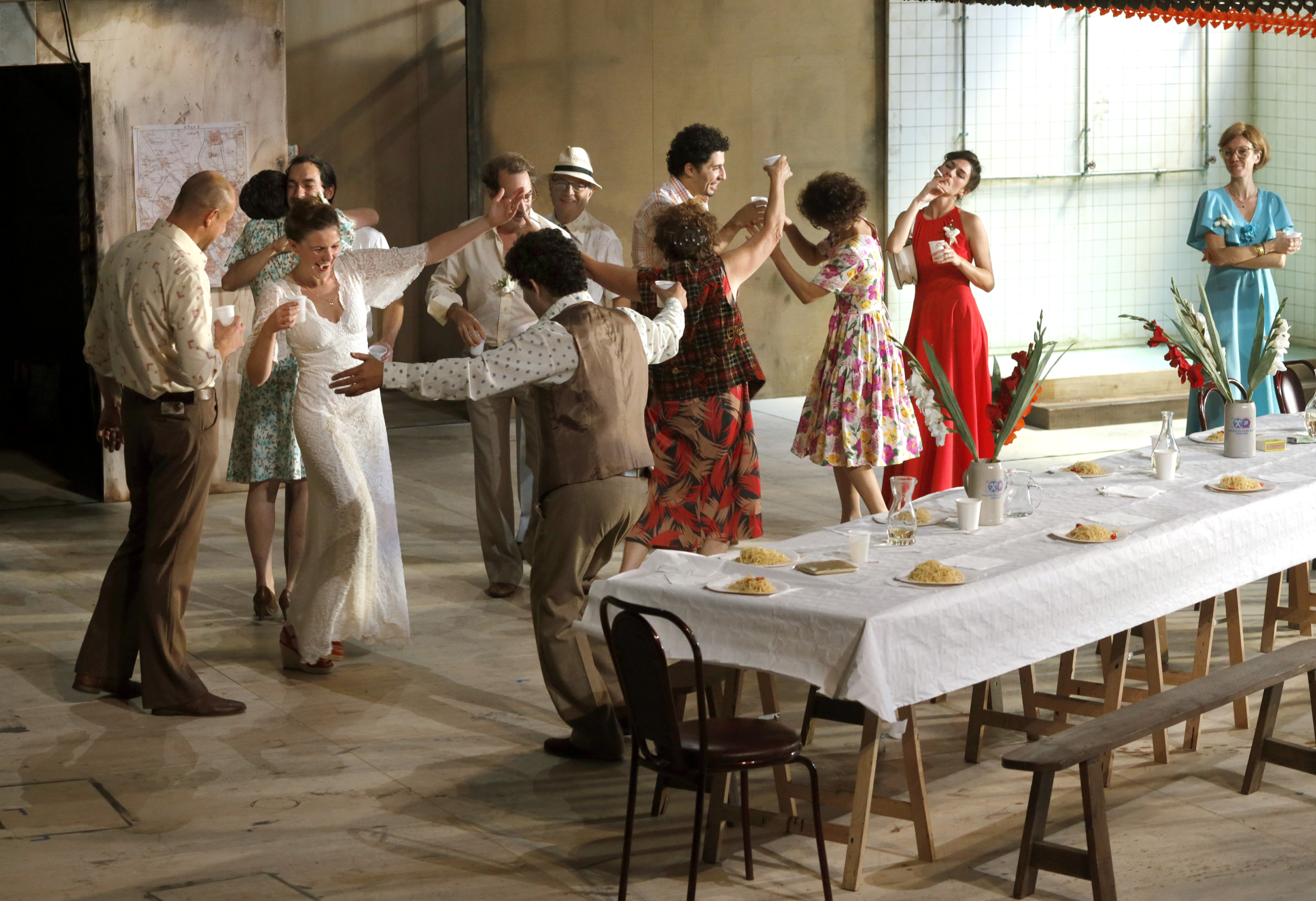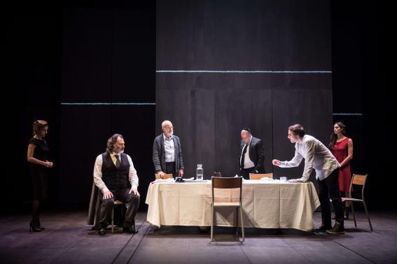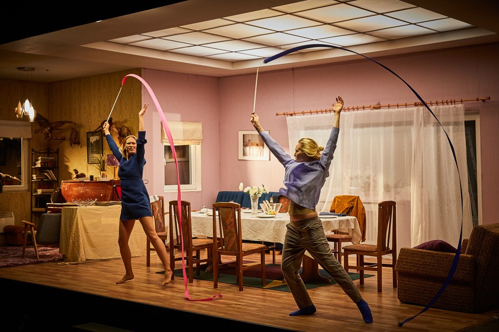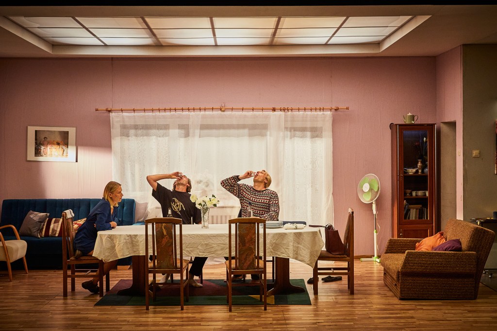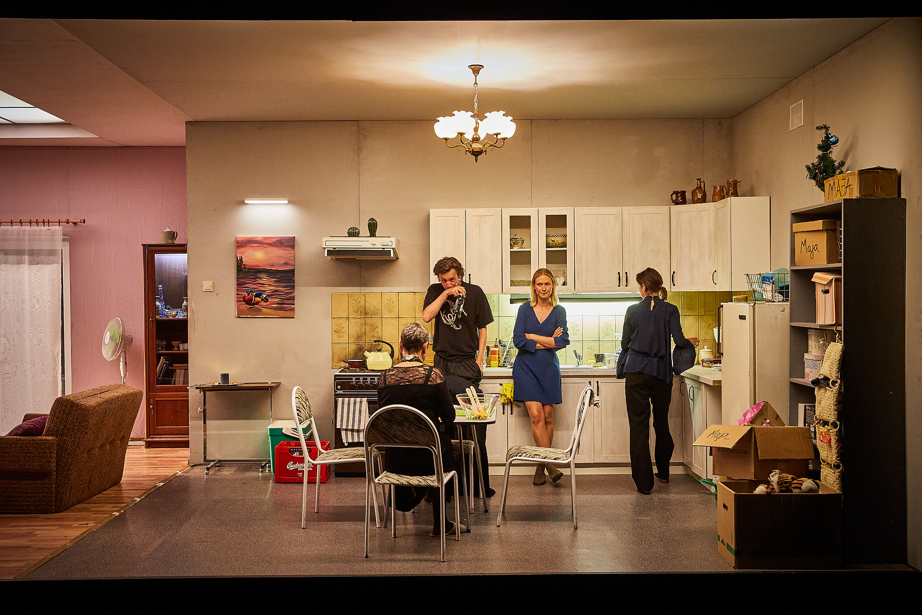 Le deuxième acte, purement théâtral celui-là, débute dans ce nouveau décor on ne peut plus réaliste comme dans les meilleurs films avec son salon au centre de la scène et de part et d’autre la cuisine et la salle de bain, le tout dans la même continuité visuelle. Place est ainsi faite aux protagonistes de ce repas de famille qui ne commencera jamais vraiment : la mère et ses deux filles affublées de maris plutôt portés sur la boisson et ne songeant qu’à s’aviner, ce quintette étant accompagné par une cousine… Cela bouge beaucoup, d’un espace l’autre et même hors champs, les relations entre les personnages, notamment entre les deux sœurs, savamment disséquées, jusqu’à ce qu’enfin soient dévoilés les véritables motifs de la présence de l’une des filles, Maja, celle-là même qui a subi le traumatisme de la perte de son enfant six mois auparavant.