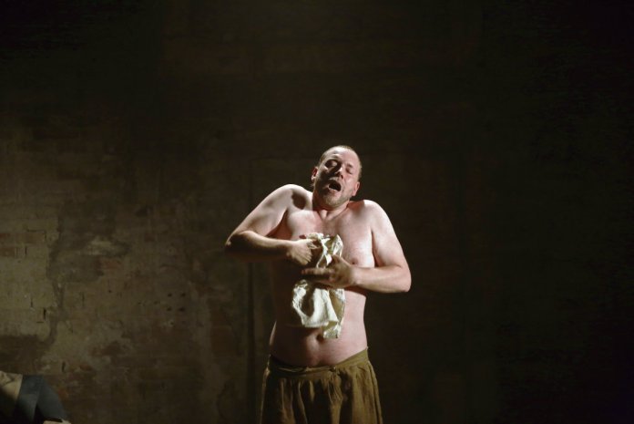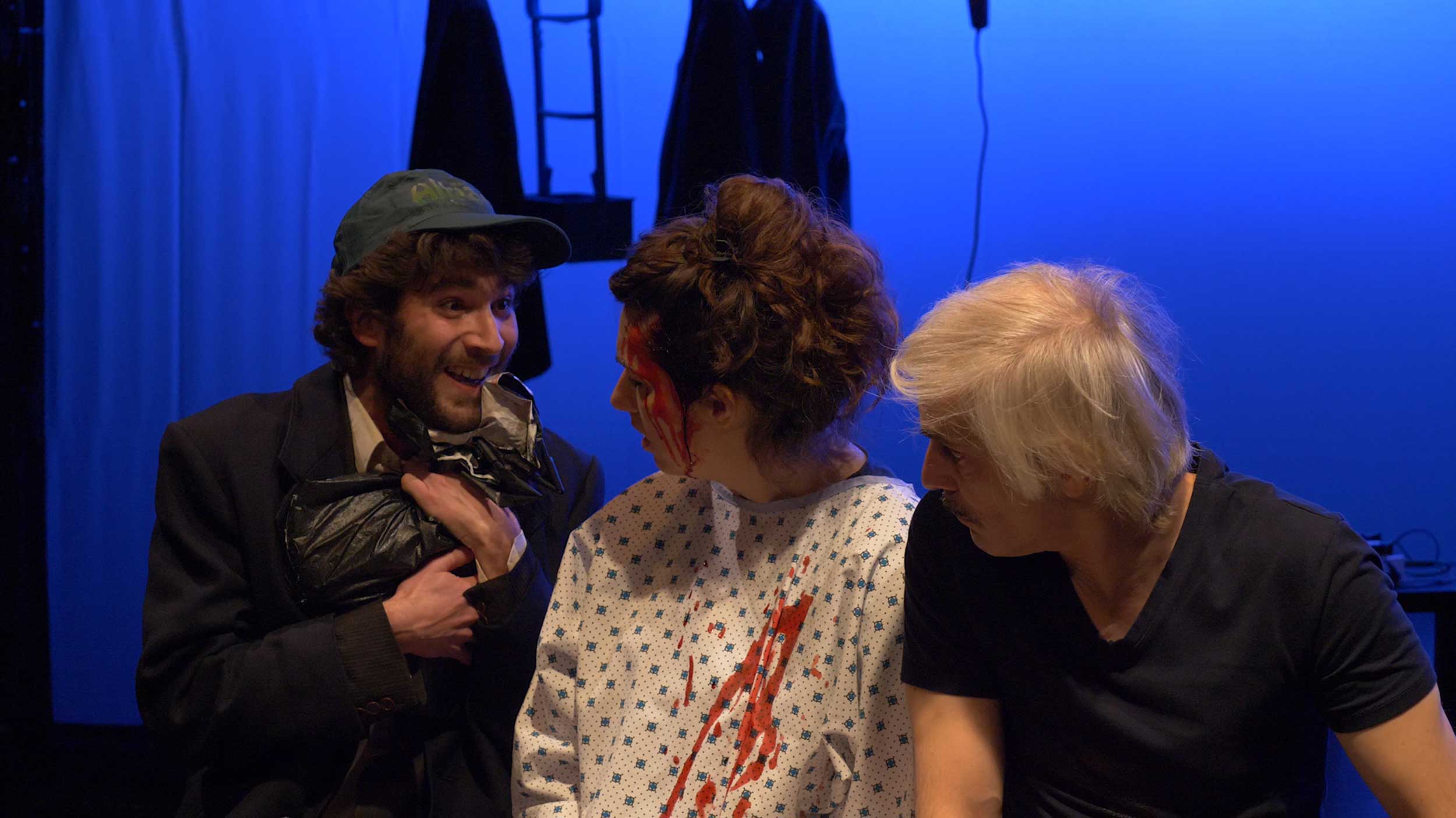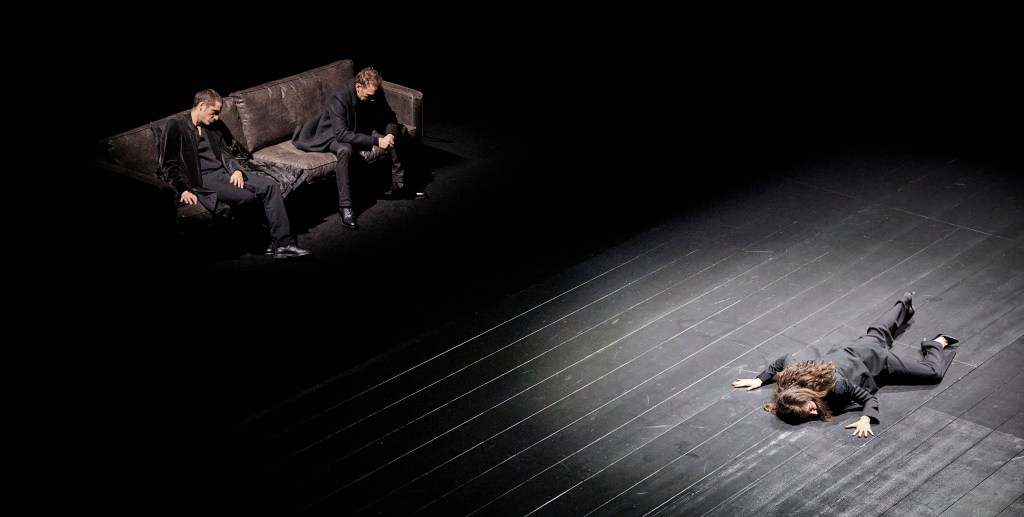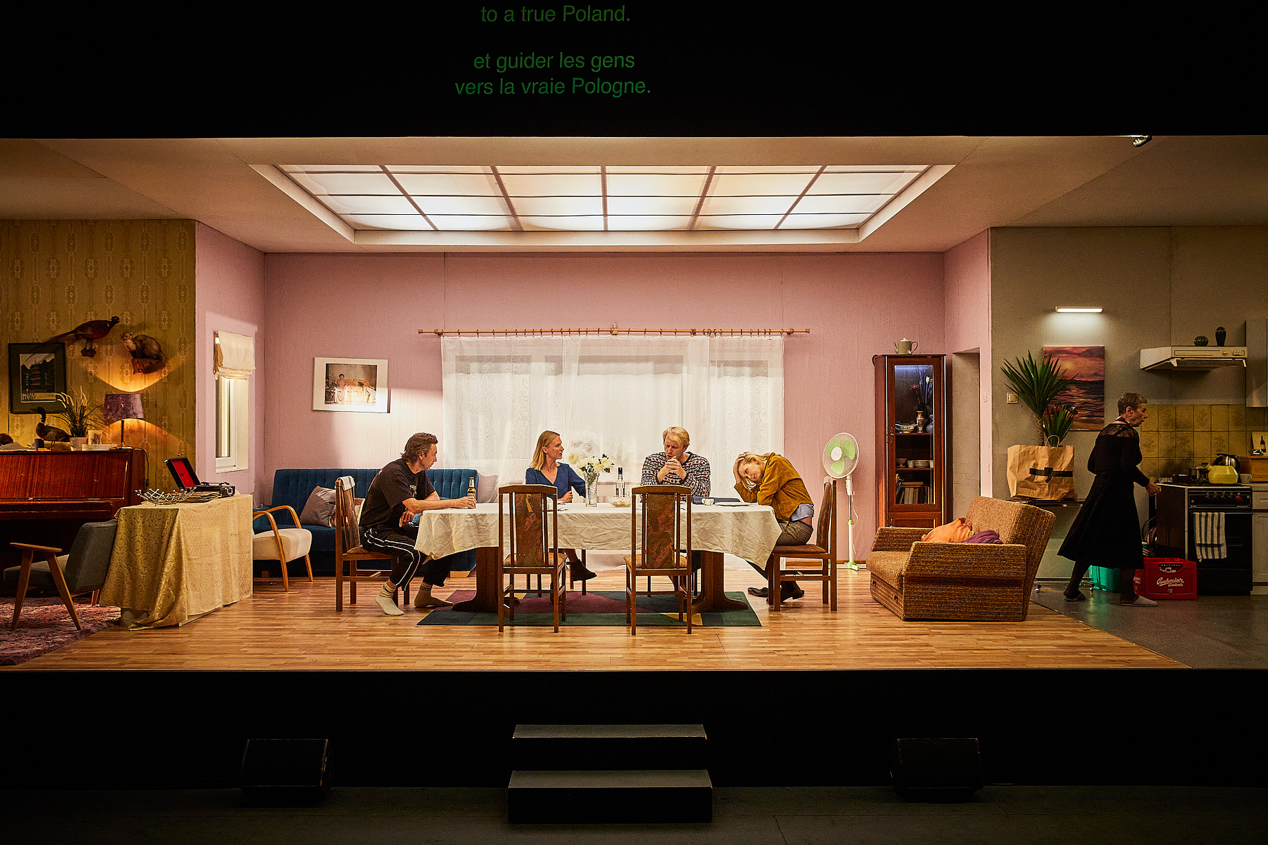 C’est donc la version théâtrale d’origine, avec sa distribution polonaise (et quelle distribution : ils sont tous admirables !), qui nous est proposée avec cependant un détour par le cinéma. Ainsi, le spectacle s’ouvre sur une séquence filmique de près de 35 minutes, une description réalisée au plus près du visage et du corps d’une jeune femme dans les affres de l’accouchement : long, très long moment, un long plan-séquence volontairement difficile à supporter pour aboutir à la mort de son enfant. Une séquence à trois personnages : la mère, le père présent dans toute sa balourdise qui est totalement à côté de la plaque, une sage-femme dont c’est le premier accouchement… On reste tétanisé ! Commence alors un changement complet de décor, opéré à vue d’œil et dans le jeu de la trame dramatique.